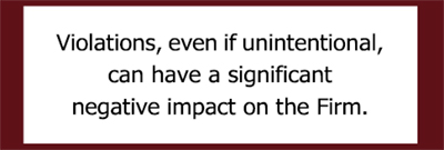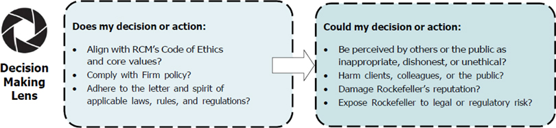 Noncompliance with Rockefeller’s Code of Ethics can put our clients and colleagues at risk, result in significant legal and regulatory exposure for the Firm, and subject Rockefeller’s legacy to serious reputational harm. Non-adherence to this policy may subject you to disciplinary and/or other corrective actions.