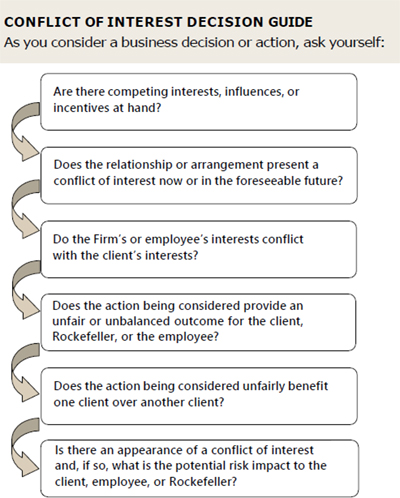 To ensure Rockefeller maintains its reputation and commitment to the highest ethical standards, the Firm has established a Conflicts of Interest Policy that requires Rockefeller, its various business units, and Supervised persons to: