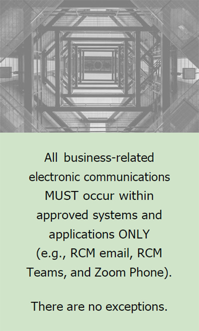 Employees may not use personal email, text messaging, or any other non-approved communication application to interact with clients, prospective clients, or any fellow RCM employee when discussing business-related matters. Any attempt to violate, circumvent, and/or disregard these requirements may result in disciplinary action, up to and including termination.