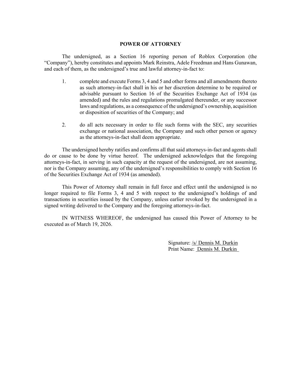 POWER OF ATTORNEY The undersigned, as a Section 16 reporting person of Roblox Corporation (the “Company”), hereby constitutes and appoints Mark Reinstra, Adele Freedman and Hans Gunawan, and each of them, as the undersigned’s true and lawful attorney-in-fact to: 1. complete and execute Forms 3, 4 and 5 and other forms and all amendments thereto as such attorney-in-fact shall in his or her discretion determine to be required or advisable pursuant to Section 16 of the Securities Exchange Act of 1934 (as amended) and the rules and regulations promulgated thereunder, or any successor laws and regulations, as a consequence of the undersigned’s ownership, acquisition or disposition of securities of the Company; and 2. do all acts necessary in order to file such forms with the SEC, any securities exchange or national association, the Company and such other person or agency as the attorneys-in-fact shall deem appropriate. The undersigned hereby ratifies and confirms all that said attorneys-in-fact and agents shall do or cause to be done by virtue hereof. The undersigned acknowledges that the foregoing attorneys-in-fact, in serving in such capacity at the request of the undersigned, are not assuming, nor is the Company assuming, any of the undersigned’s responsibilities to comply with Section 16 of the Securities Exchange Act of 1934 (as amended). This Power of Attorney shall remain in full force and effect until the undersigned is no longer required to file Forms 3, 4 and 5 with respect to the undersigned’s holdings of and transactions in securities issued by the Company, unless earlier revoked by the undersigned in a signed writing delivered to the Company and the foregoing attorneys-in-fact. IN WITNESS WHEREOF, the undersigned has caused this Power of Attorney to be executed as of March 19, 2026. Signature: /s/ Dennis M. Durkin Print Name: Dennis M. Durkin