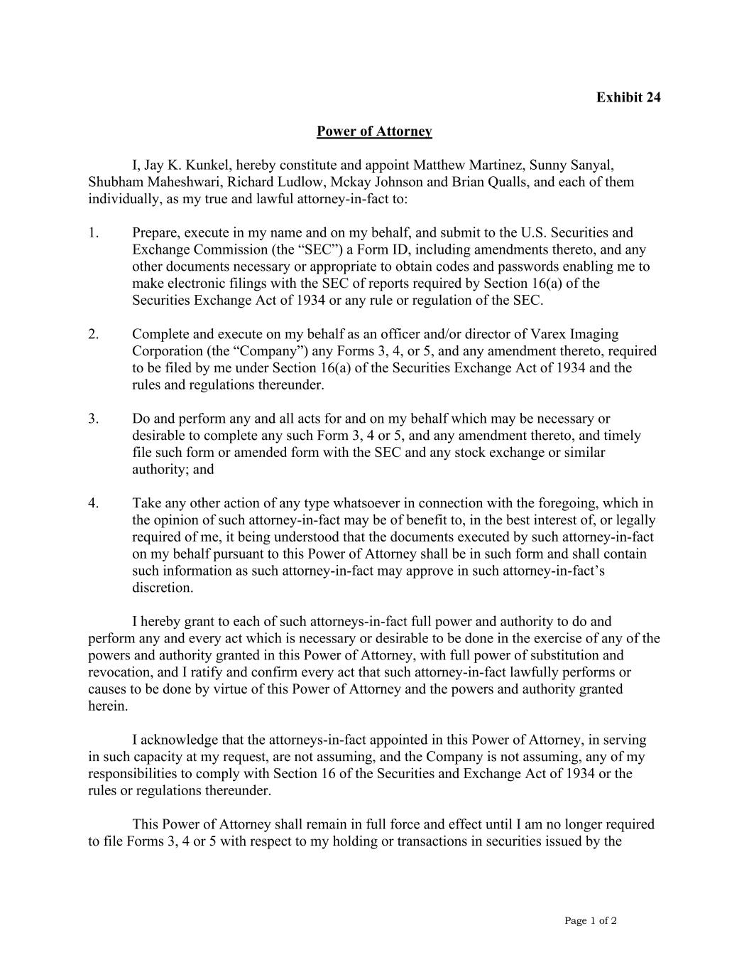 Page 1 of 2 Exhibit 24 Power of Attorney I, Jay K. Kunkel, hereby constitute and appoint Matthew Martinez, Sunny Sanyal, Shubham Maheshwari, Richard Ludlow, Mckay Johnson and Brian Qualls, and each of them individually, as my true and lawful attorney-in-fact to: 1. Prepare, execute in my name and on my behalf, and submit to the U.S. Securities and Exchange Commission (the “SEC”) a Form ID, including amendments thereto, and any other documents necessary or appropriate to obtain codes and passwords enabling me to make electronic filings with the SEC of reports required by Section 16(a) of the Securities Exchange Act of 1934 or any rule or regulation of the SEC. 2. Complete and execute on my behalf as an officer and/or director of Varex Imaging Corporation (the “Company”) any Forms 3, 4, or 5, and any amendment thereto, required to be filed by me under Section 16(a) of the Securities Exchange Act of 1934 and the rules and regulations thereunder. 3. Do and perform any and all acts for and on my behalf which may be necessary or desirable to complete any such Form 3, 4 or 5, and any amendment thereto, and timely file such form or amended form with the SEC and any stock exchange or similar authority; and 4. Take any other action of any type whatsoever in connection with the foregoing, which in the opinion of such attorney-in-fact may be of benefit to, in the best interest of, or legally required of me, it being understood that the documents executed by such attorney-in-fact on my behalf pursuant to this Power of Attorney shall be in such form and shall contain such information as such attorney-in-fact may approve in such attorney-in-fact’s discretion. I hereby grant to each of such attorneys-in-fact full power and authority to do and perform any and every act which is necessary or desirable to be done in the exercise of any of the powers and authority granted in this Power of Attorney, with full power of substitution and revocation, and I ratify and confirm every act that such attorney-in-fact lawfully performs or causes to be done by virtue of this Power of Attorney and the powers and authority granted herein. I acknowledge that the attorneys-in-fact appointed in this Power of Attorney, in serving in such capacity at my request, are not assuming, and the Company is not assuming, any of my responsibilities to comply with Section 16 of the Securities and Exchange Act of 1934 or the rules or regulations thereunder. This Power of Attorney shall remain in full force and effect until I am no longer required to file Forms 3, 4 or 5 with respect to my holding or transactions in securities issued by the
