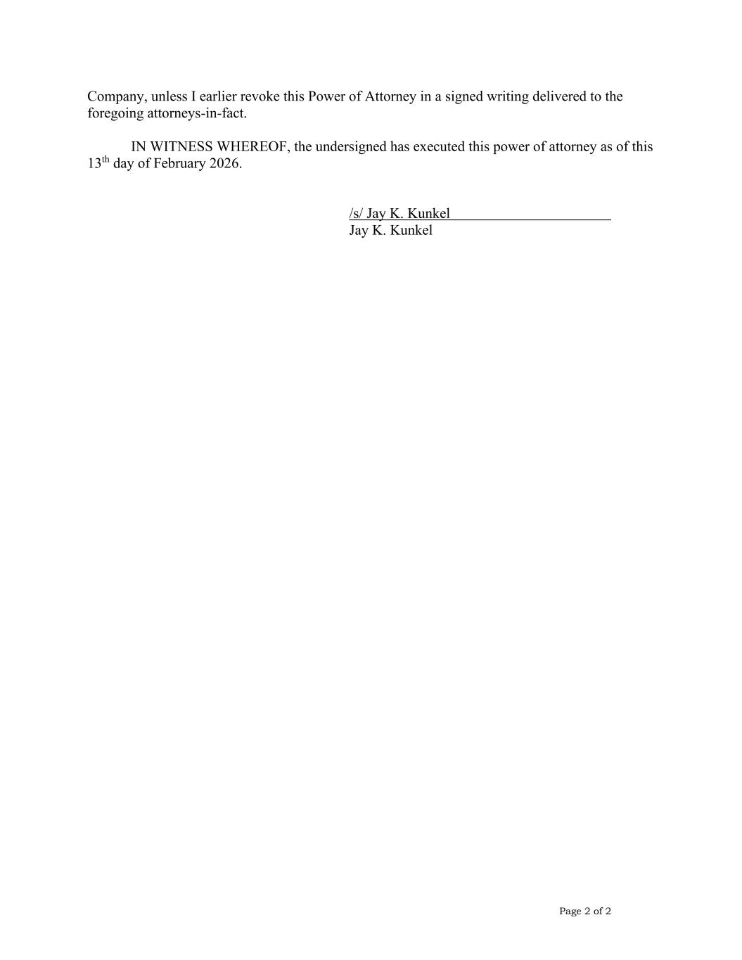Page 2 of 2 Company, unless I earlier revoke this Power of Attorney in a signed writing delivered to the foregoing attorneys-in-fact. IN WITNESS WHEREOF, the undersigned has executed this power of attorney as of this 13th day of February 2026. /s/ Jay K. Kunkel Jay K. Kunkel