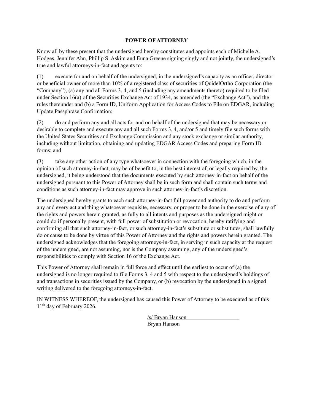 POWER OF ATTORNEY Know all by these present that the undersigned hereby constitutes and appoints each of Michelle A. Hodges, Jennifer Ahn, Phillip S. Askim and Euna Greene signing singly and not jointly, the undersigned’s true and lawful attorneys-in-fact and agents to: (1) execute for and on behalf of the undersigned, in the undersigned’s capacity as an officer, director or beneficial owner of more than 10% of a registered class of securities of QuidelOrtho Corporation (the “Company”), (a) any and all Forms 3, 4, and 5 (including any amendments thereto) required to be filed under Section 16(a) of the Securities Exchange Act of 1934, as amended (the “Exchange Act”), and the rules thereunder and (b) a Form ID, Uniform Application for Access Codes to File on EDGAR, including Update Passphrase Confirmation; (2) do and perform any and all acts for and on behalf of the undersigned that may be necessary or desirable to complete and execute any and all such Forms 3, 4, and/or 5 and timely file such forms with the United States Securities and Exchange Commission and any stock exchange or similar authority, including without limitation, obtaining and updating EDGAR Access Codes and preparing Form ID forms; and (3) take any other action of any type whatsoever in connection with the foregoing which, in the opinion of such attorney-in-fact, may be of benefit to, in the best interest of, or legally required by, the undersigned, it being understood that the documents executed by such attorney-in-fact on behalf of the undersigned pursuant to this Power of Attorney shall be in such form and shall contain such terms and conditions as such attorney-in-fact may approve in such attorney-in-fact’s discretion. The undersigned hereby grants to each such attorney-in-fact full power and authority to do and perform any and every act and thing whatsoever requisite, necessary, or proper to be done in the exercise of any of the rights and powers herein granted, as fully to all intents and purposes as the undersigned might or could do if personally present, with full power of substitution or revocation, hereby ratifying and confirming all that such attorney-in-fact, or such attorney-in-fact’s substitute or substitutes, shall lawfully do or cause to be done by virtue of this Power of Attorney and the rights and powers herein granted. The undersigned acknowledges that the foregoing attorneys-in-fact, in serving in such capacity at the request of the undersigned, are not assuming, nor is the Company assuming, any of the undersigned’s responsibilities to comply with Section 16 of the Exchange Act. This Power of Attorney shall remain in full force and effect until the earliest to occur of (a) the undersigned is no longer required to file Forms 3, 4 and 5 with respect to the undersigned’s holdings of and transactions in securities issued by the Company, or (b) revocation by the undersigned in a signed writing delivered to the foregoing attorneys-in-fact. IN WITNESS WHEREOF, the undersigned has caused this Power of Attorney to be executed as of this 11th day of February 2026. /s/ Bryan Hanson Bryan Hanson