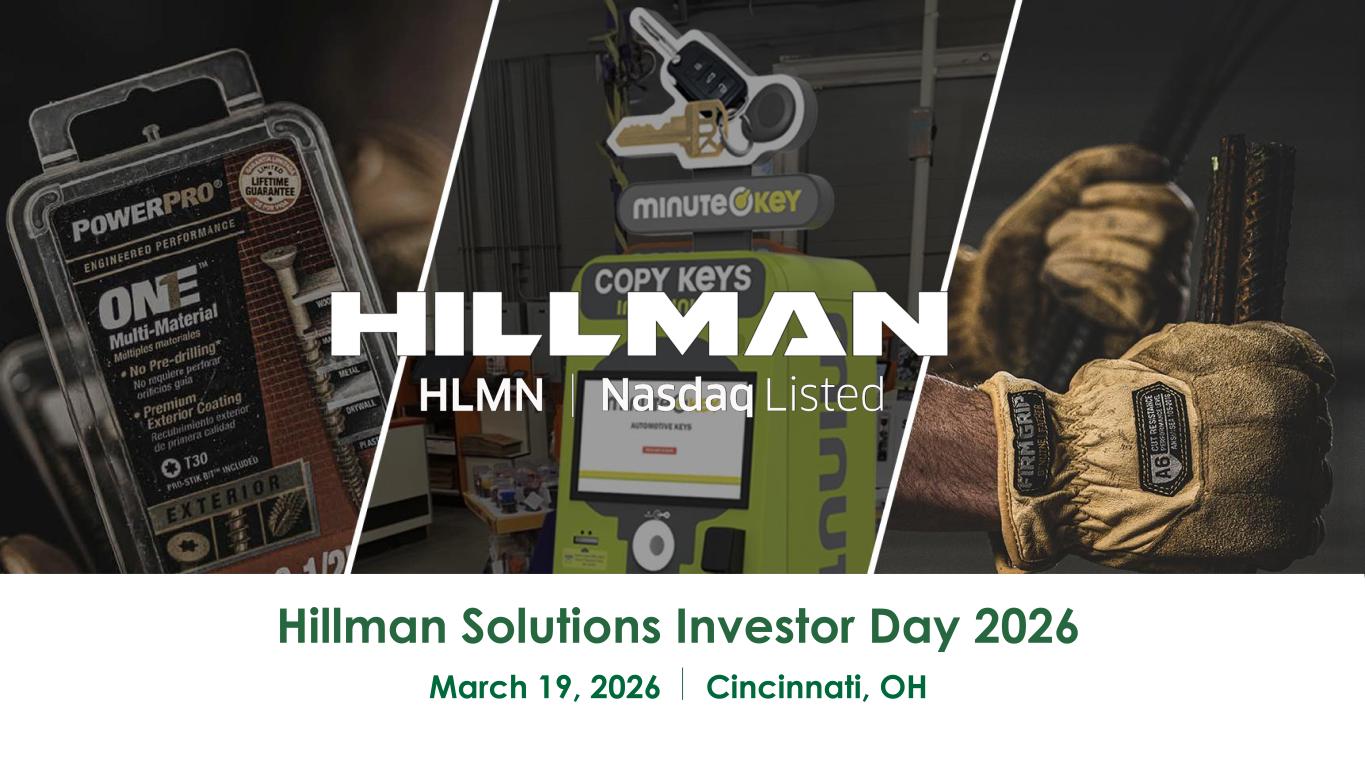 Hillman Solutions Investor Day 2026 March 19, 2026 Cincinnati, OH #26673F #102F93 #279A56 #4EA72E#239FFF #0E2841 text #279A56 #4EA72E text