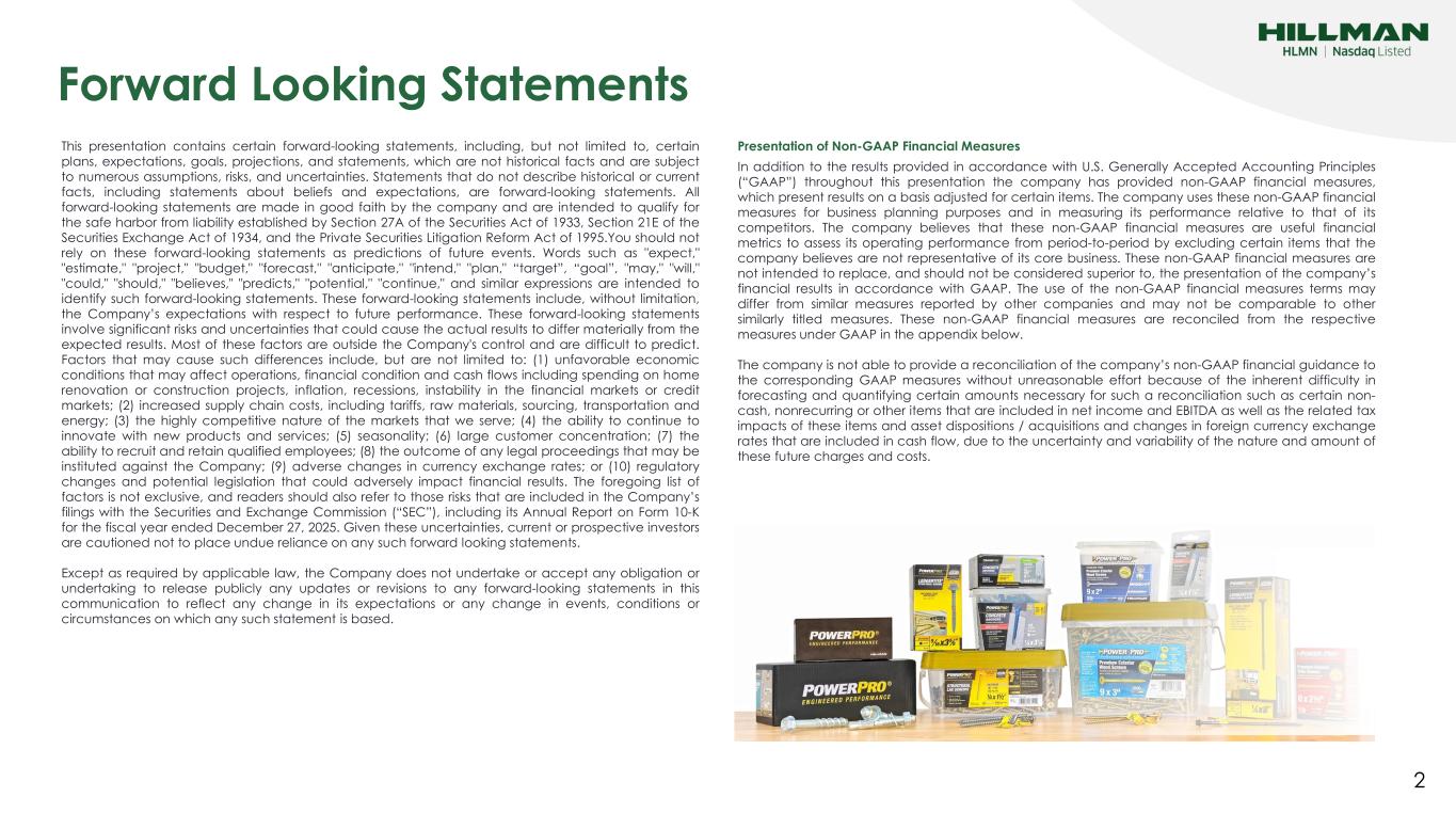 #26673F #102F93 #279A56 #4EA72E#239FFF #0E2841 #279A56 #4EA72E Forward Looking Statements This presentation contains certain forward-looking statements, including, but not limited to, certain plans, expectations, goals, projections, and statements, which are not historical facts and are subject to numerous assumptions, risks, and uncertainties. Statements that do not describe historical or current facts, including statements about beliefs and expectations, are forward-looking statements. All forward-looking statements are made in good faith by the company and are intended to qualify for the safe harbor from liability established by Section 27A of the Securities Act of 1933, Section 21E of the Securities Exchange Act of 1934, and the Private Securities Litigation Reform Act of 1995.You should not rely on these forward-looking statements as predictions of future events. Words such as "expect," "estimate," "project," "budget," "forecast," "anticipate," "intend," "plan," “target”, “goal”, "may," "will," "could," "should," "believes," "predicts," "potential," "continue," and similar expressions are intended to identify such forward-looking statements. These forward-looking statements include, without limitation, the Company’s expectations with respect to future performance. These forward-looking statements involve significant risks and uncertainties that could cause the actual results to differ materially from the expected results. Most of these factors are outside the Company's control and are difficult to predict. Factors that may cause such differences include, but are not limited to: (1) unfavorable economic conditions that may affect operations, financial condition and cash flows including spending on home renovation or construction projects, inflation, recessions, instability in the financial markets or credit markets; (2) increased supply chain costs, including tariffs, raw materials, sourcing, transportation and energy; (3) the highly competitive nature of the markets that we serve; (4) the ability to continue to innovate with new products and services; (5) seasonality; (6) large customer concentration; (7) the ability to recruit and retain qualified employees; (8) the outcome of any legal proceedings that may be instituted against the Company; (9) adverse changes in currency exchange rates; or (10) regulatory changes and potential legislation that could adversely impact financial results. The foregoing list of factors is not exclusive, and readers should also refer to those risks that are included in the Company’s filings with the Securities and Exchange Commission (“SEC”), including its Annual Report on Form 10-K for the fiscal year ended December 27, 2025. Given these uncertainties, current or prospective investors are cautioned not to place undue reliance on any such forward looking statements. Except as required by applicable law, the Company does not undertake or accept any obligation or undertaking to release publicly any updates or revisions to any forward-looking statements in this communication to reflect any change in its expectations or any change in events, conditions or circumstances on which any such statement is based. Presentation of Non-GAAP Financial Measures In addition to the results provided in accordance with U.S. Generally Accepted Accounting Principles (“GAAP”) throughout this presentation the company has provided non-GAAP financial measures, which present results on a basis adjusted for certain items. The company uses these non-GAAP financial measures for business planning purposes and in measuring its performance relative to that of its competitors. The company believes that these non-GAAP financial measures are useful financial metrics to assess its operating performance from period-to-period by excluding certain items that the company believes are not representative of its core business. These non-GAAP financial measures are not intended to replace, and should not be considered superior to, the presentation of the company’s financial results in accordance with GAAP. The use of the non-GAAP financial measures terms may differ from similar measures reported by other companies and may not be comparable to other similarly titled measures. These non-GAAP financial measures are reconciled from the respective measures under GAAP in the appendix below. The company is not able to provide a reconciliation of the company’s non-GAAP financial guidance to the corresponding GAAP measures without unreasonable effort because of the inherent difficulty in forecasting and quantifying certain amounts necessary for such a reconciliation such as certain non- cash, nonrecurring or other items that are included in net income and EBITDA as well as the related tax impacts of these items and asset dispositions / acquisitions and changes in foreign currency exchange rates that are included in cash flow, due to the uncertainty and variability of the nature and amount of these future charges and costs. 2 text