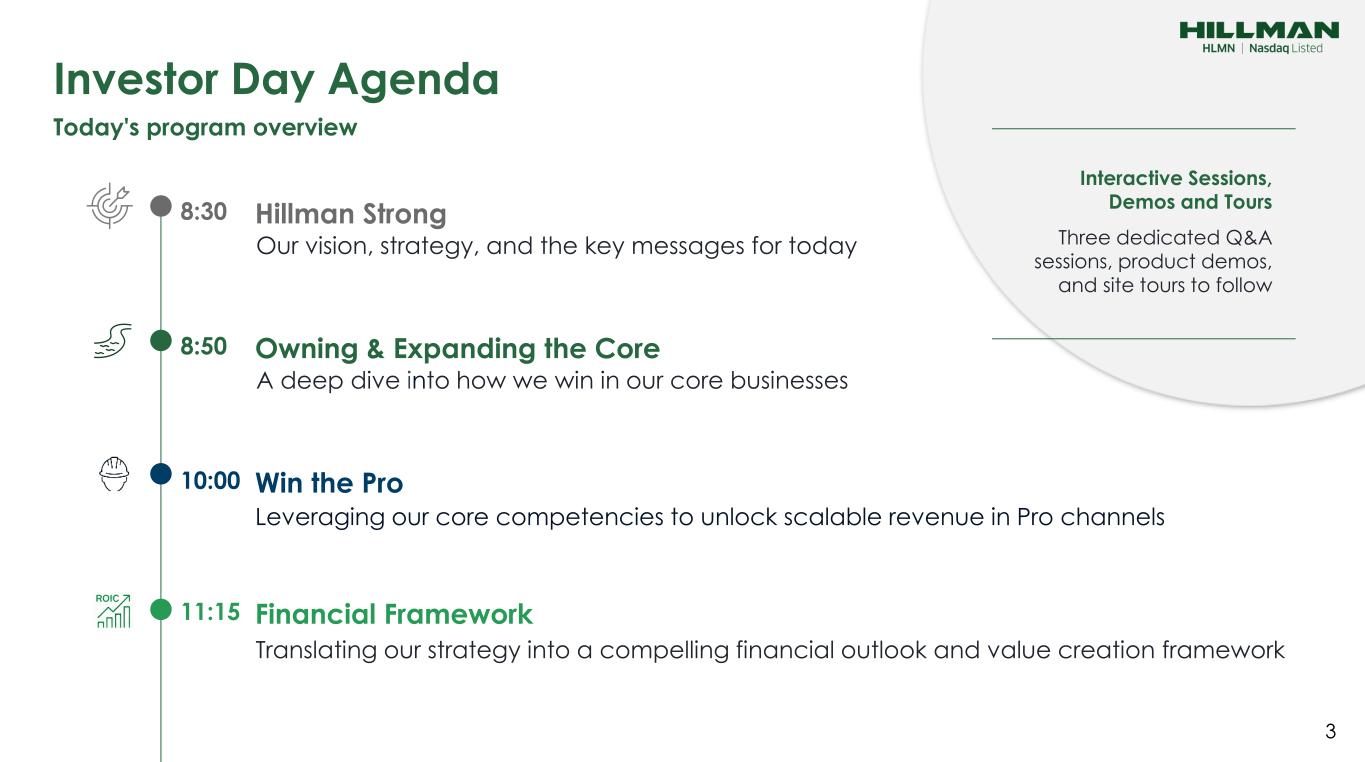 #26673F #102F93 #279A56 #4EA72E#239FFF #0E2841 #279A56 #4EA72E Investor Day Agenda Hillman Strong Our vision, strategy, and the key messages for today Owning & Expanding the Core A deep dive into how we win in our core businesses Win the Pro Leveraging our core competencies to unlock scalable revenue in Pro channels Financial Framework Translating our strategy into a compelling financial outlook and value creation framework 8:30 8:50 10:00 11:15 Interactive Sessions, Demos and Tours Three dedicated Q&A sessions, product demos, and site tours to follow Today's program overview text 3