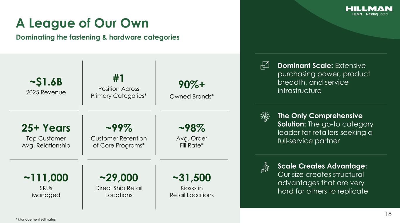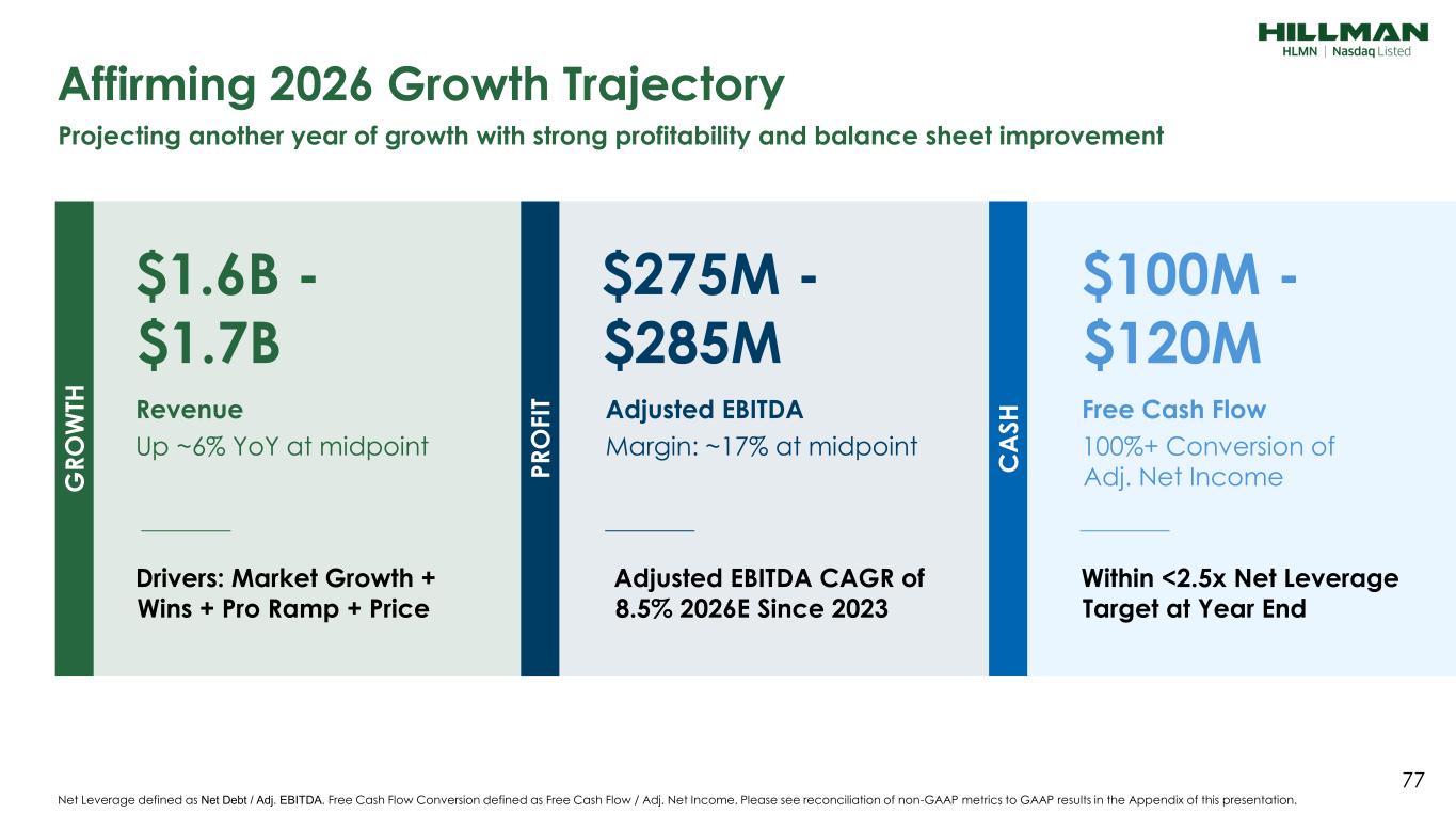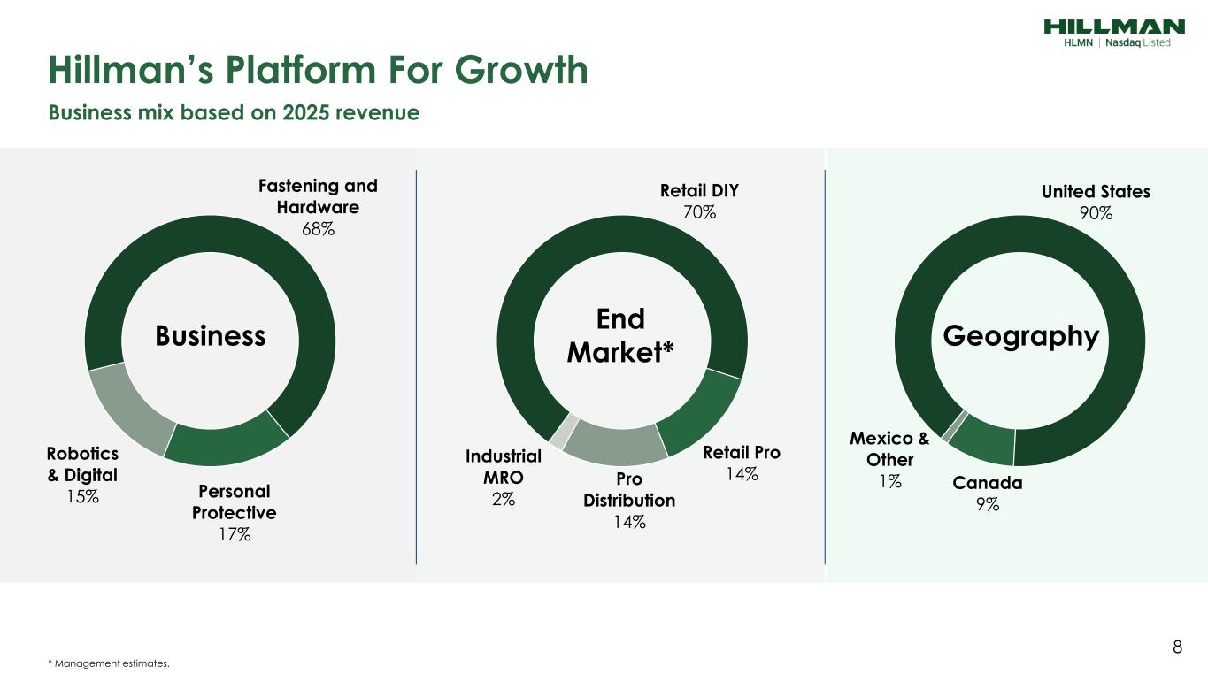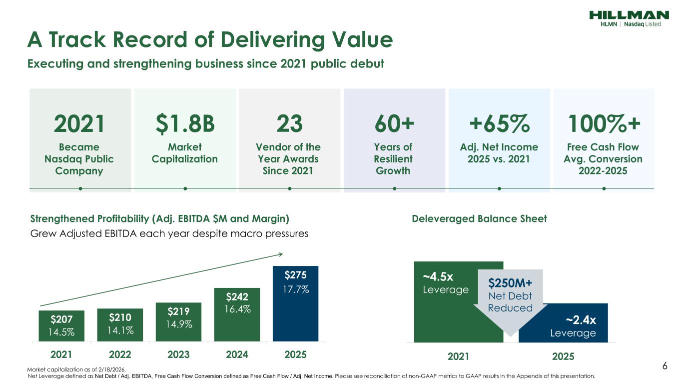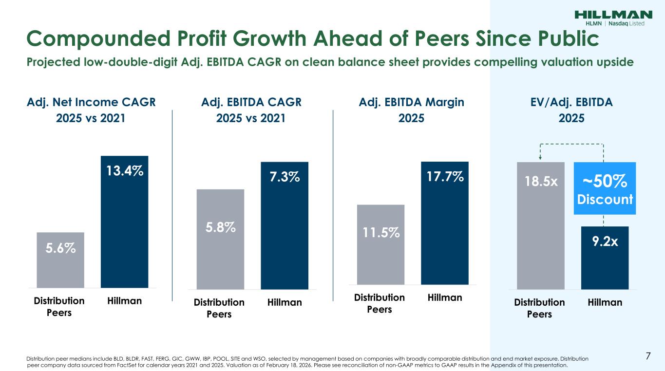 #26673F #102F93 #279A56 #4EA72E#239FFF #0E2841 #279A56 #4EA72E Projected low-double-digit Adj. EBITDA CAGR on clean balance sheet provides compelling valuation upside Compounded Profit Growth Ahead of Peers Since Public text 5.6% 13.4% -0.2% 1.8% 3.8% 5.8% 7.8% 9.8% 11.8% 13.8% Distribution Peers Hillman Adj. Net Income CAGR 2025 vs 2021 5.8% 7.3% 0.0% 1.0% 2.0% 3.0% 4.0% 5.0% 6.0% 7.0% Distribution Peers Hillman Adj. EBITDA CAGR 2025 vs 2021 11.5% 17.7% -0.9% 1.1% 3.1% 5.1% 7.1% 9.1% 11.1% 13.1% 15.1% 17.1% 19.1% Distribution Peers Hillman Adj. EBITDA Margin 2025 Distribution peer medians include BLD, BLDR, FAST, FERG, GIC, GWW, IBP, POOL, SITE and WSO, selected by management based on companies with broadly comparable distribution and end market exposure. Distribution peer company data sourced from FactSet for calendar years 2021 and 2025. Valuation as of February 18, 2026. Please see reconciliation of non-GAAP metrics to GAAP results in the Appendix of this presentation. 18.5x 9.2x 0.0x 2.0x 4.0x 6.0x 8.0x 10.0x 12.0x 14.0x 16.0x 18.0x 20.0x Distribution Peers Hillman EV/Adj. EBITDA 2025 ~50% Discount 7