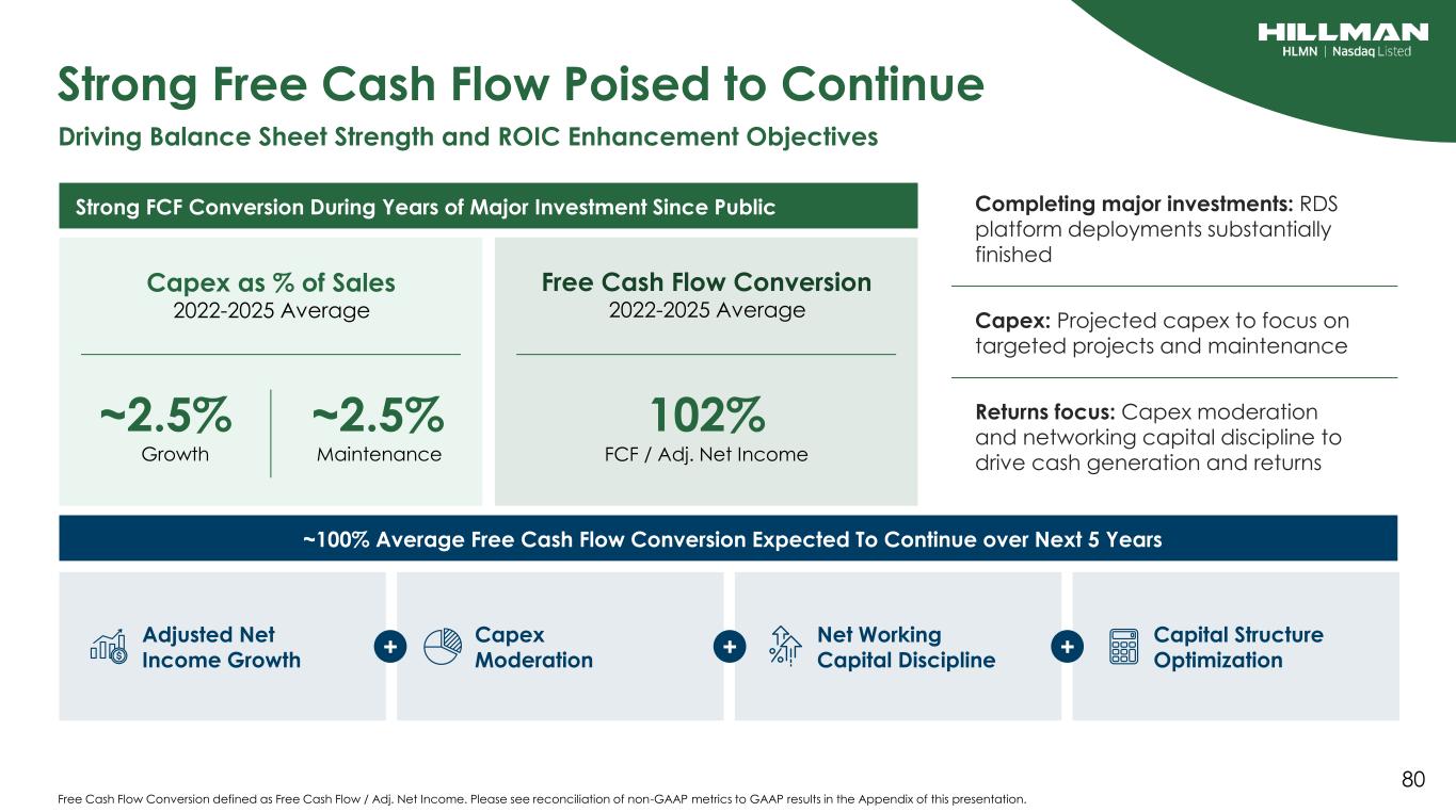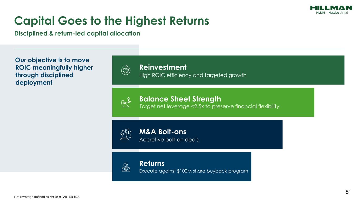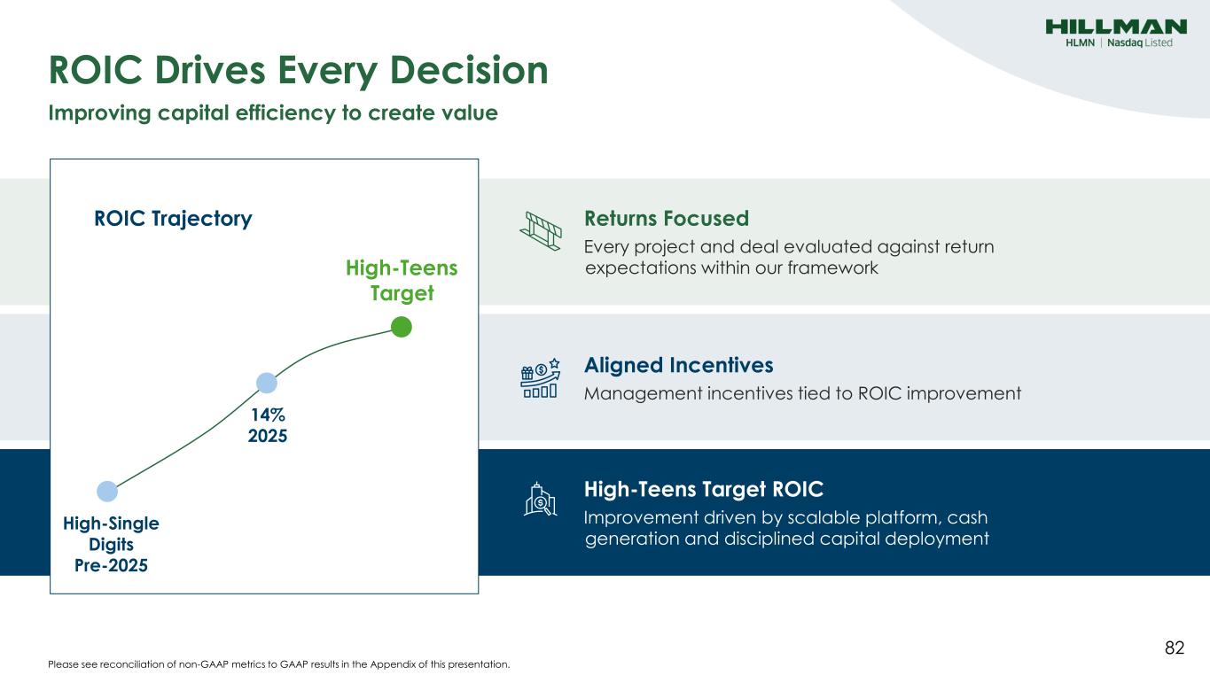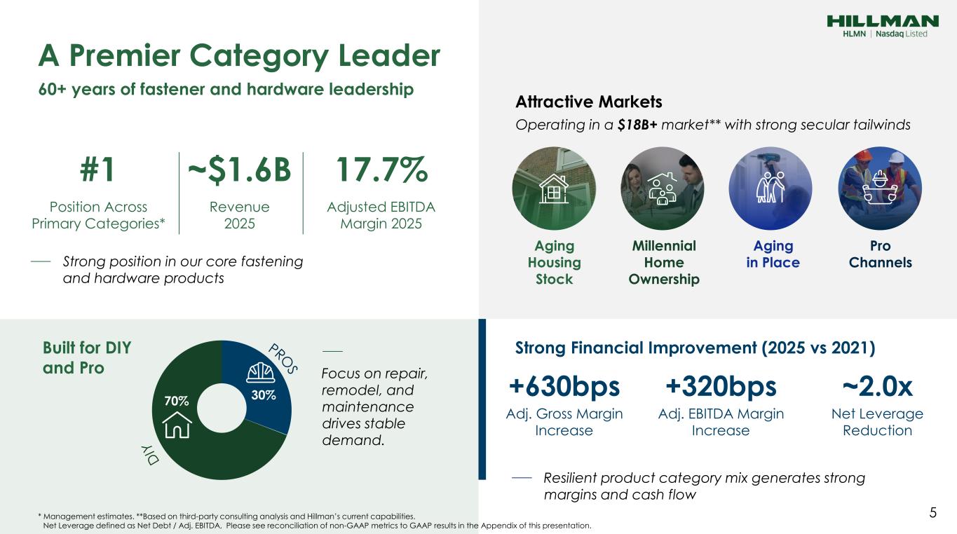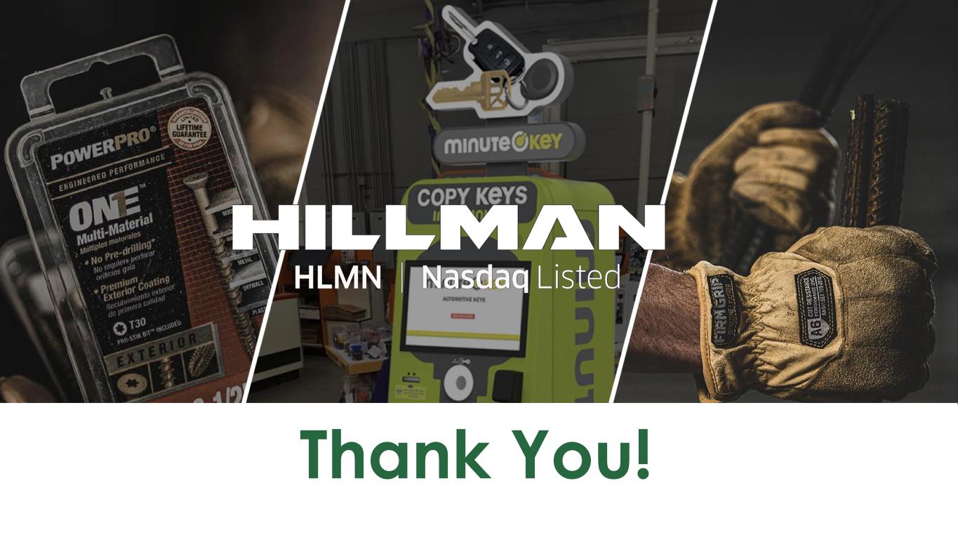 #26673F #102F93 #279A56 #4EA72E#239FFF #0E2841 #279A56 #4EA72E Projected low-double-digit Adj. EBITDA CAGR on clean balance sheet provides compelling valuation upside Compounded Profit Growth Ahead of Peers Since Public text 5.6% 13.4% -0.2% 1.8% 3.8% 5.8% 7.8% 9.8% 11.8% 13.8% Distribution Peers Hillman Adj. Net Income CAGR 2025 vs 2021 5.8% 7.3% 0.0% 1.0% 2.0% 3.0% 4.0% 5.0% 6.0% 7.0% Distribution Peers Hillman Adj. EBITDA CAGR 2025 vs 2021 11.5% 17.7% -0.9% 1.1% 3.1% 5.1% 7.1% 9.1% 11.1% 13.1% 15.1% 17.1% 19.1% Distribution Peers Hillman Adj. EBITDA Margin 2025 Distribution peer medians include BLD, BLDR, FAST, FERG, GIC, GWW, IBP, POOL, SITE and WSO, selected by management based on companies with broadly comparable distribution and end market exposure. Distribution peer company data sourced from FactSet for calendar years 2021 and 2025. Valuation as of February 18, 2026. Please see reconciliation of non-GAAP metrics to GAAP results in the Appendix of this presentation. 18.5x 9.2x 0.0x 2.0x 4.0x 6.0x 8.0x 10.0x 12.0x 14.0x 16.0x 18.0x 20.0x Distribution Peers Hillman EV/Adj. EBITDA 2025 ~50% Discount 7