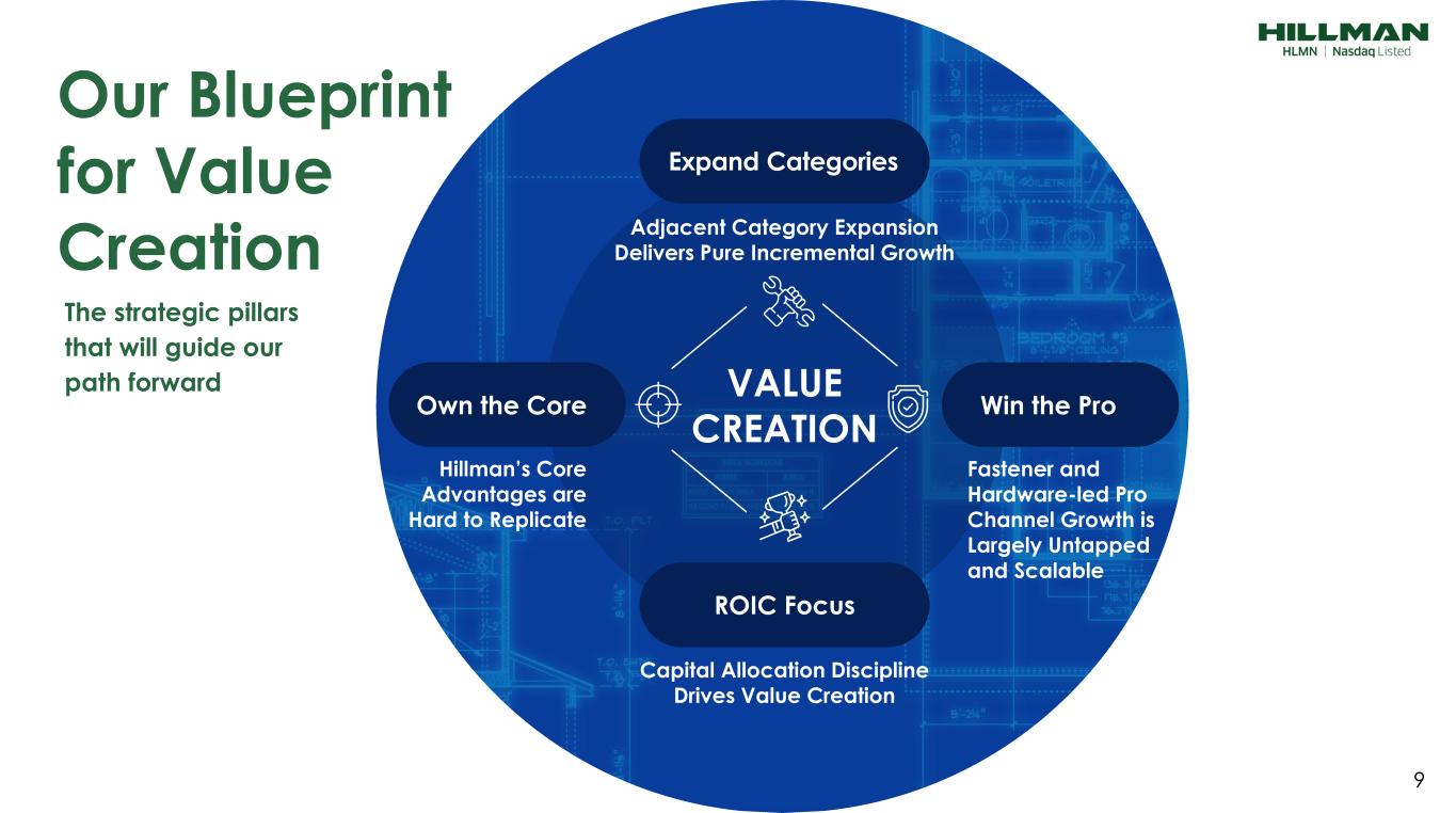#26673F #102F93 #279A56 #4EA72E#239FFF #0E2841 #279A56 #4EA72E Business mix based on 2025 revenue Hillman’s Platform For Growth Fastening and Hardware 68% Personal Protective 17% Robotics & Digital 15% United States 90% Canada 9% Mexico & Other 1% Retail DIY 70% Retail Pro 14%Pro Distribution 14% Industrial MRO 2% Business End Market* Geography text * Management estimates. 8