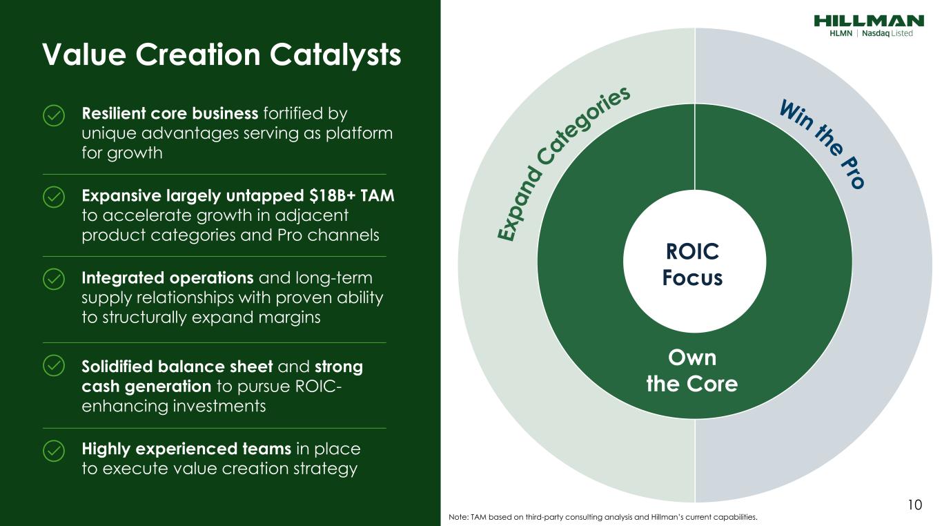 #26673F #102F93 #279A56 #4EA72E#239FFF #0E2841 #279A56 #4EA72E text The strategic pillars that will guide our path forward Our Blueprint for Value Creation Hillman’s Core Advantages are Hard to Replicate VALUE CREATION Expand Categories Win the Pro ROIC Focus Adjacent Category Expansion Delivers Pure Incremental Growth Fastener and Hardware-led Pro Channel Growth is Largely Untapped and Scalable Capital Allocation Discipline Drives Value Creation Own the Core 9
