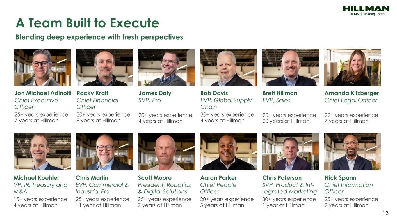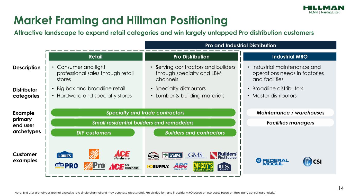 A Team Built to Execute Blending deep experience with fresh perspectives Jon Michael Adinolfi Chief Executive Officer 25+ years experience 7 years at Hillman Rocky Kraft Chief Financial Officer 30+ years experience 8 years at Hillman James Daly SVP, Pro 20+ years experience 4 years at Hillman Bob Davis EVP, Global Supply Chain 30+ years experience 4 years at Hillman Michael Koehler VP, IR, Treasury and M&A 15+ years experience 4 years at Hillman Chris Martin EVP, Commercial & Industrial Pro 25+ years experience ~1 year at Hillman Scott Moore President, Robotics & Digital Solutions 25+ years experience 7 years at Hillman Aaron Parker Chief People Officer 20+ years experience 5 years at Hillman Amanda Kitzberger Chief Legal Officer 22+ years experience 7 years at Hillman Nick Spann Chief Information Officer 25+ years experience 2 years at Hillman Chris Paterson SVP, Product & Int- -egrated Marketing 30+ years experience 1 year at Hillman Brett Hillman EVP, Sales 20+ years experience 20 years at Hillman 13