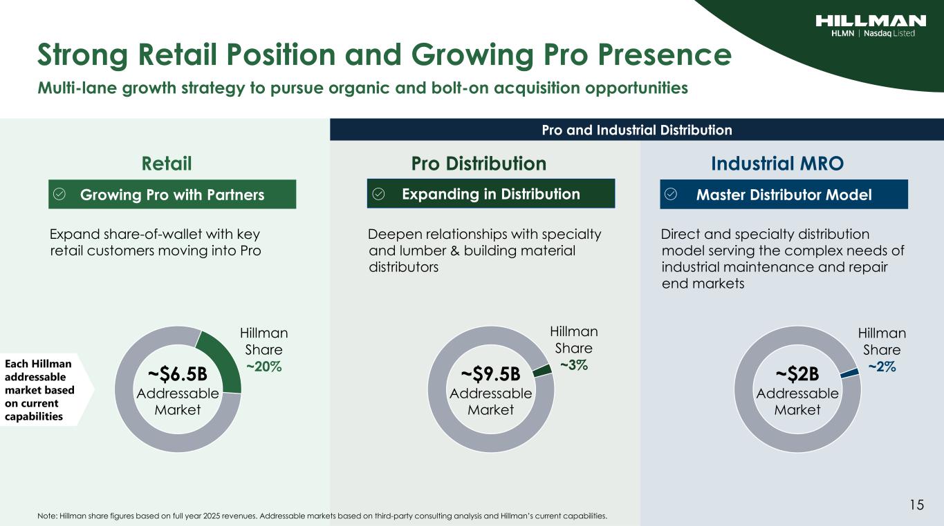 #26673F #102F93 #279A56 #4EA72E#239FFF #0E2841 #279A56 #4EA72E Attractive landscape to expand retail categories and win largely untapped Pro distribution customers Market Framing and Hillman Positioning 14 text Description Distributor categories Customer examples Example primary end user archetypes Pro and Industrial Distribution • Consumer and light professional sales through retail stores Industrial MROPro DistributionRetail • Industrial maintenance and operations needs in factories and facilities • Big box and broadline retail • Hardware and specialty stores • Broadline distributors • Master distributors • Serving contractors and builders through specialty and LBM channels • Specialty distributors • Lumber & building materials Maintenance / warehouses Facilities managers DIY customers Builders and contractors Small residential builders and remodelers Specialty and trade contractors Note: End user archetypes are not exclusive to a single channel and may purchase across retail, Pro distribution, and industrial MRO based on use case; Based on third-party consulting analysis.