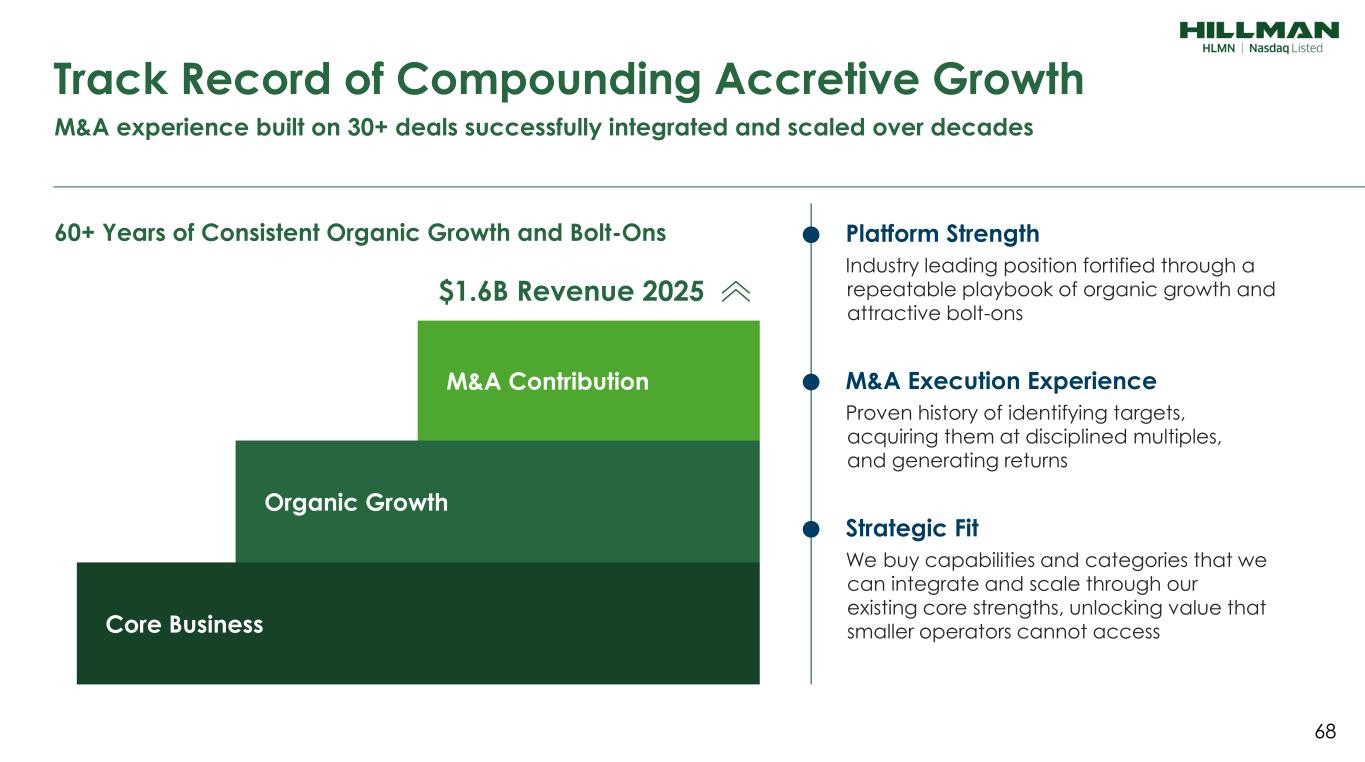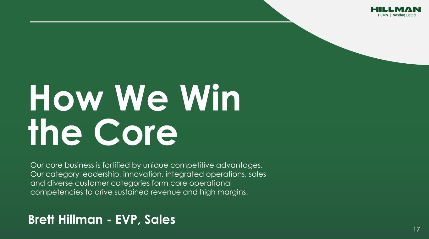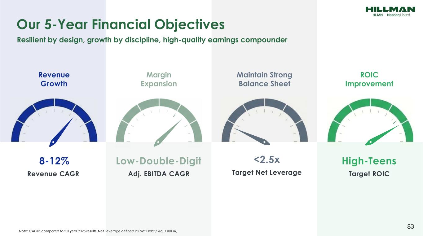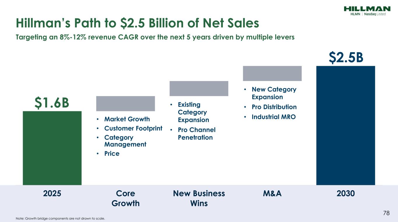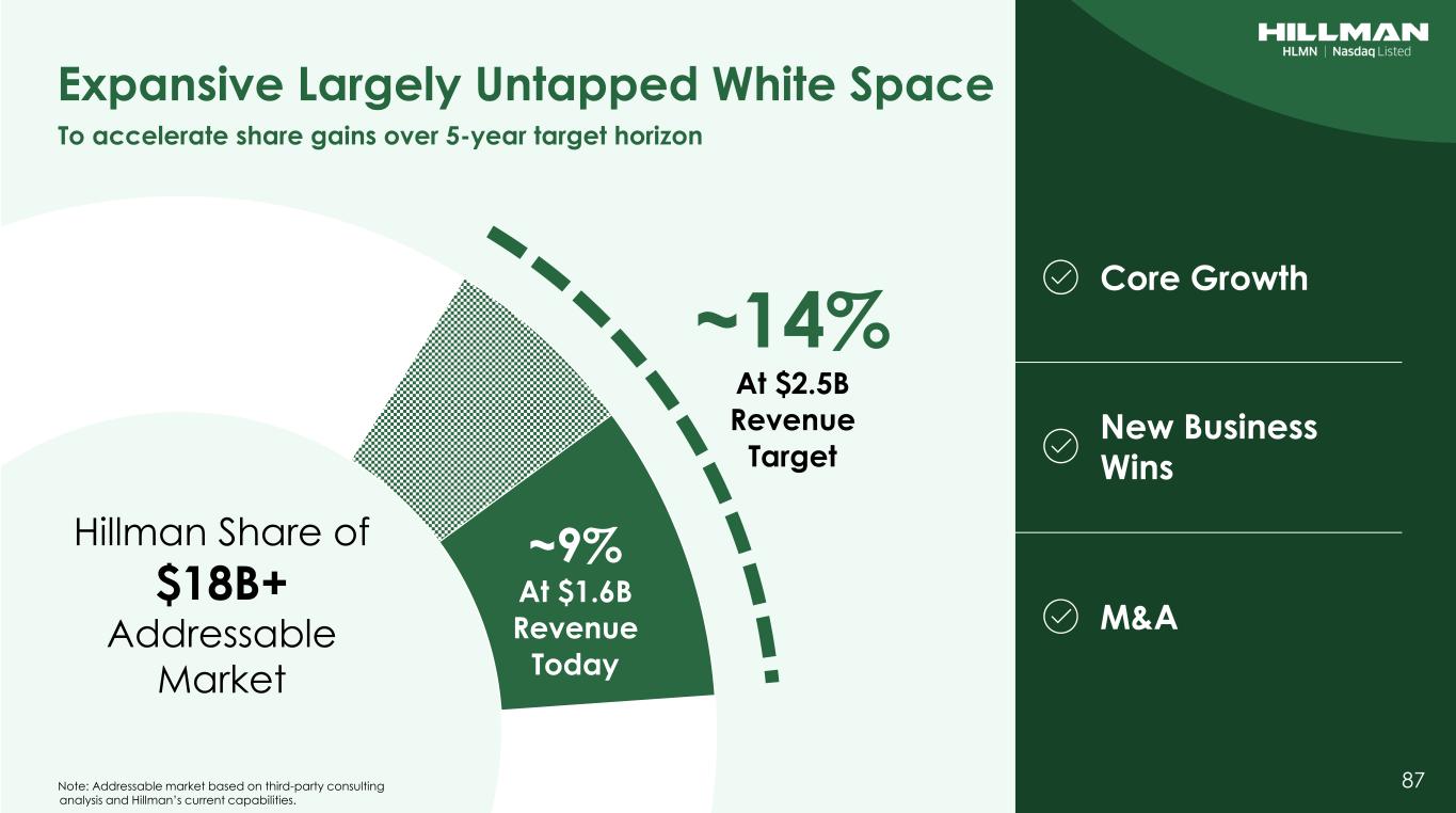 #26673F #102F93 #279A56 #4EA72E#239FFF #0E2841 #279A56 #4EA72E ~14% At $2.5B Revenue Target ~9% At $1.6B Revenue Today 93% To accelerate share gains over 5-year target horizon Expansive Largely Untapped White Space text Hillman Share of $18B+ Addressable Market New Business Wins 87 Core Growth M&A Note: Addressable market based on third-party consulting analysis and Hillman’s current capabilities.