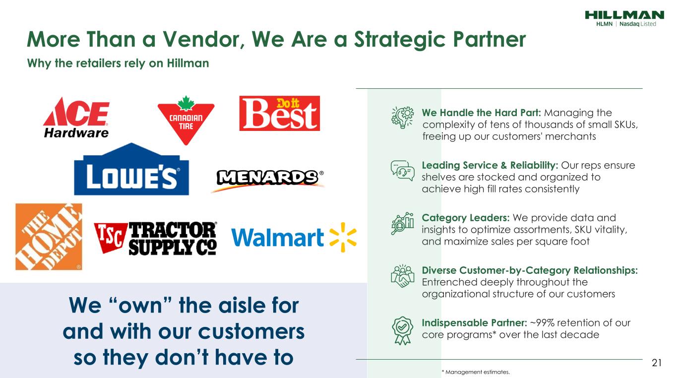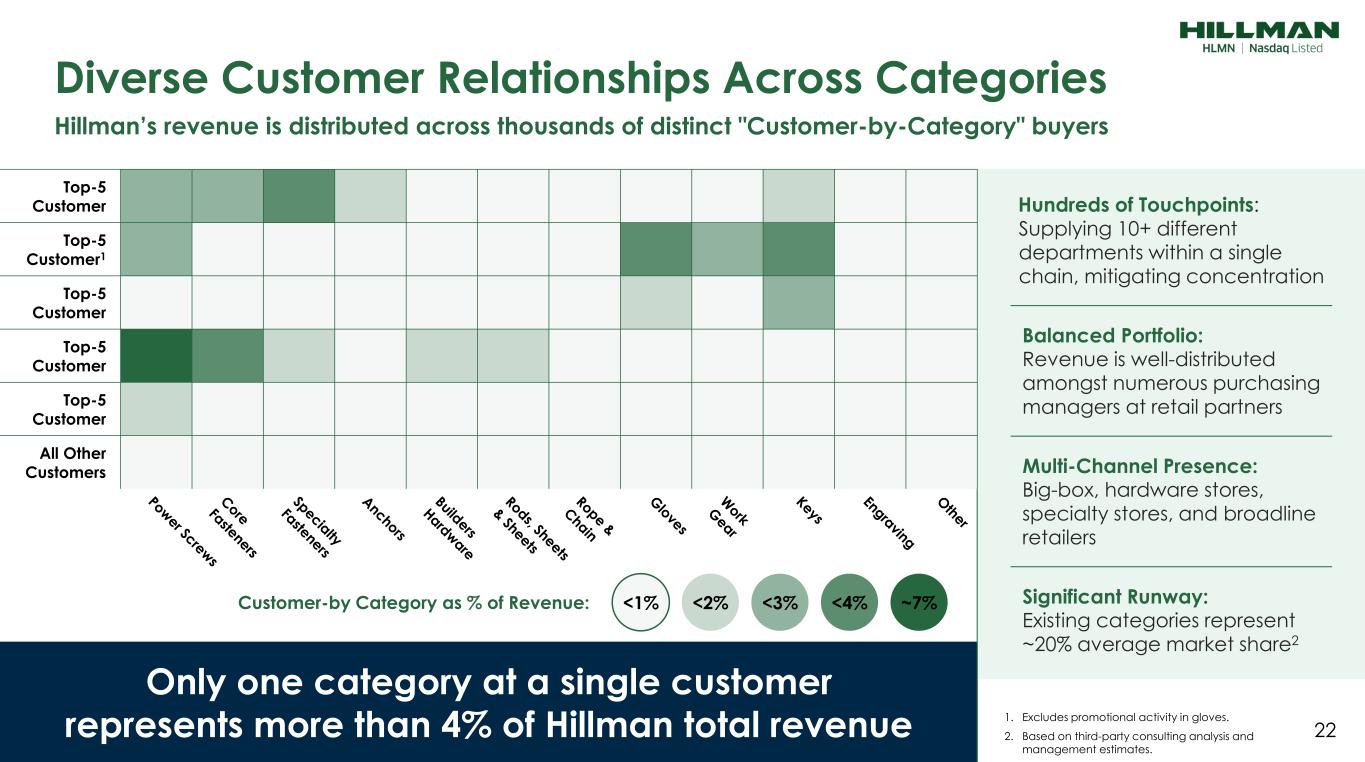 #26673F #102F93 #279A56 #4EA72E#239FFF #0E2841 #279A56 #4EA72E Why the retailers rely on Hillman More Than a Vendor, We Are a Strategic Partner We Handle the Hard Part: Managing the complexity of tens of thousands of small SKUs, freeing up our customers' merchants Leading Service & Reliability: Our reps ensure shelves are stocked and organized to achieve high fill rates consistently Category Leaders: We provide data and insights to optimize assortments, SKU vitality, and maximize sales per square foot Diverse Customer-by-Category Relationships: Entrenched deeply throughout the organizational structure of our customers We “own” the aisle for and with our customers so they don’t have to Indispensable Partner: ~99% retention of our core programs* over the last decade 21 text * Management estimates.