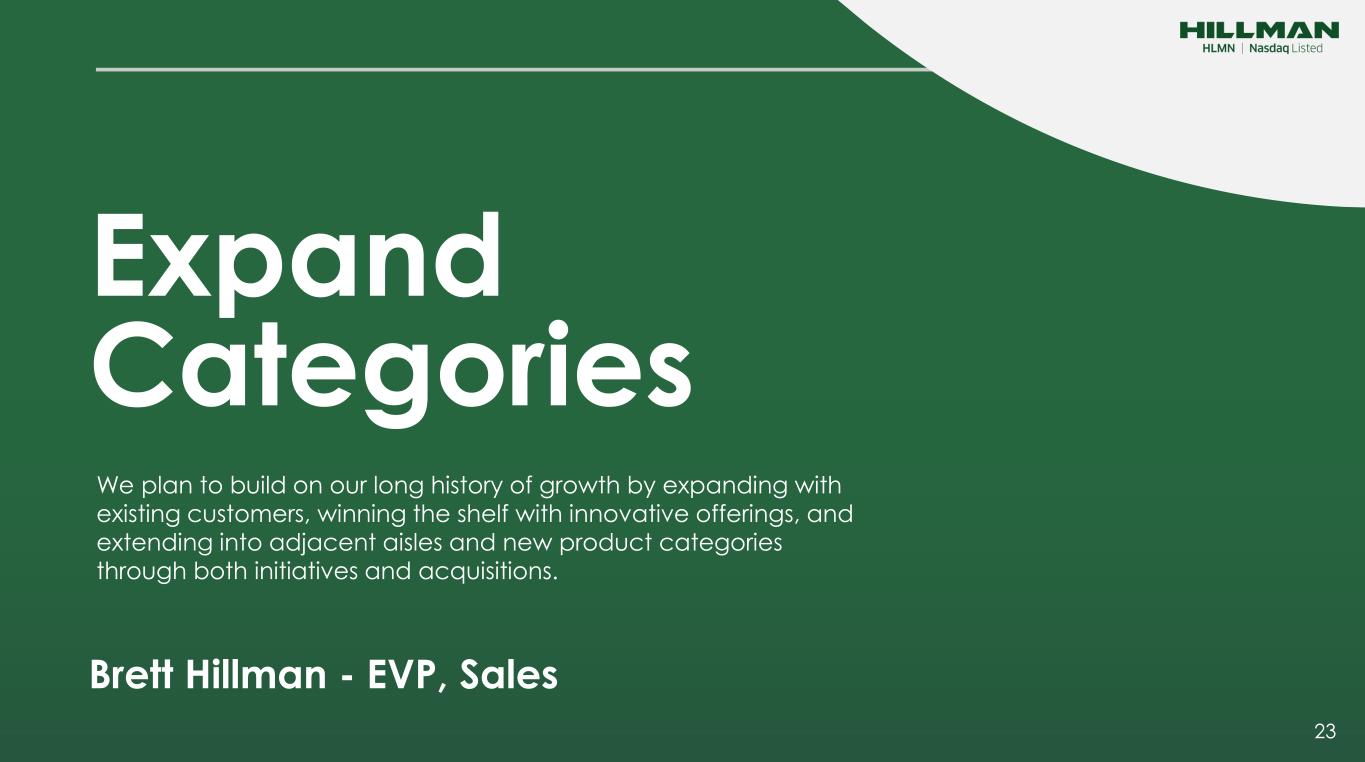 #26673F #102F93 #279A56 #4EA72E#239FFF #0E2841 #279A56 #4EA72E Expand Categories Brett Hillman - EVP, Sales 23 text We plan to build on our long history of growth by expanding with existing customers, winning the shelf with innovative offerings, and extending into adjacent aisles and new product categories through both initiatives and acquisitions.