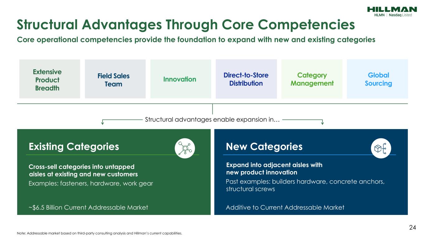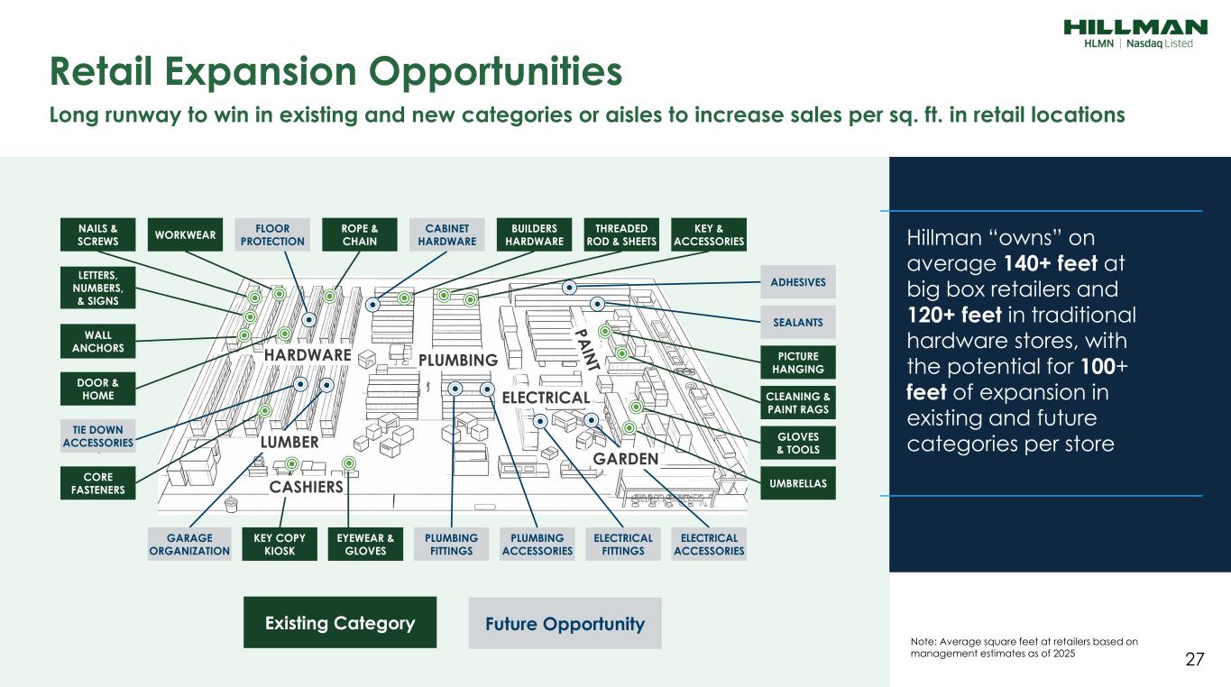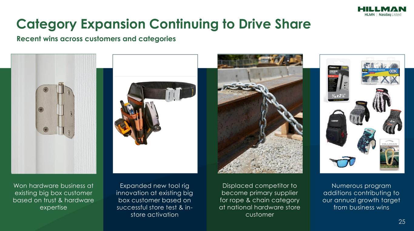 #26673F #102F93 #279A56 #4EA72E#239FFF #0E2841 #279A56 #4EA72E Core operational competencies provide the foundation to expand with new and existing categories Structural Advantages Through Core Competencies 24 text Existing Categories Cross-sell categories into untapped aisles at existing and new customers Examples: fasteners, hardware, work gear ~$6.5 Billion Current Addressable Market New Categories Expand into adjacent aisles with new product innovation Past examples: builders hardware, concrete anchors, structural screws Additive to Current Addressable Market Structural advantages enable expansion in… Category Management Direct-to-Store Distribution Innovation Extensive Product Breadth Field Sales Team Global Sourcing Note: Addressable market based on third-party consulting analysis and Hillman’s current capabilities.