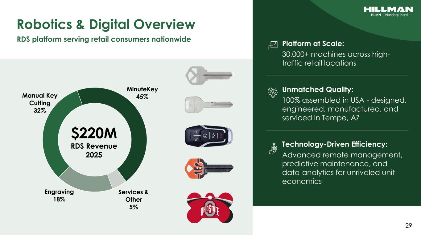 #26673F #102F93 #279A56 #4EA72E#239FFF #0E2841 #279A56 #4EA72E RDS platform serving retail consumers nationwide Robotics & Digital Overview Platform at Scale: 30,000+ machines across high- traffic retail locations Unmatched Quality: 100% assembled in USA - designed, engineered, manufactured, and serviced in Tempe, AZ Technology-Driven Efficiency: Advanced remote management, predictive maintenance, and data-analytics for unrivaled unit economics Services & Other 5% Engraving 18% Manual Key Cutting 32% MinuteKey 45% $220M RDS Revenue 2025 text 29