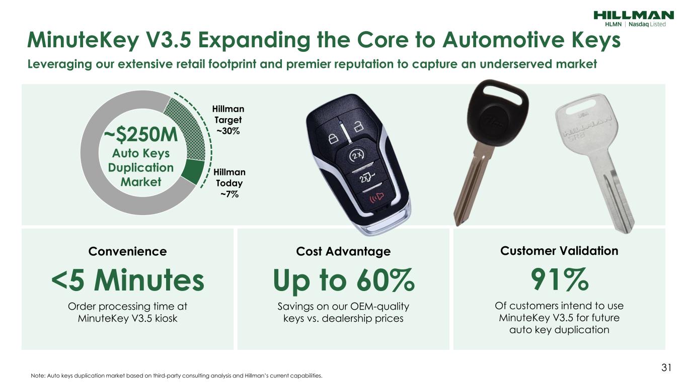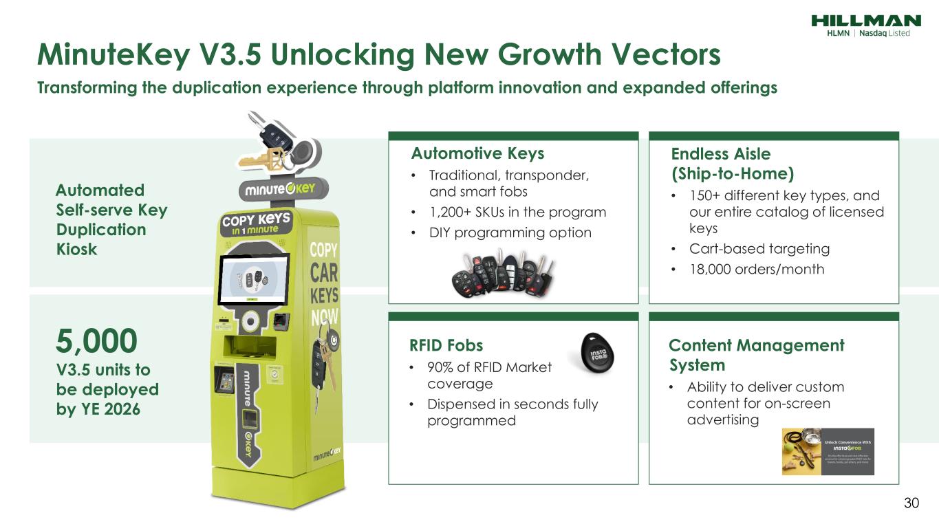 #26673F #102F93 #279A56 #4EA72E#239FFF #0E2841 #279A56 #4EA72E Transforming the duplication experience through platform innovation and expanded offerings MinuteKey V3.5 Unlocking New Growth Vectors 5,000 V3.5 units to be deployed by YE 2026 Endless Aisle (Ship-to-Home) • 150+ different key types, and our entire catalog of licensed keys • Cart-based targeting • 18,000 orders/month RFID Fobs • 90% of RFID Market coverage • Dispensed in seconds fully programmed Growth Guardrail We will avoid low-traffic sites. Quality of placement > Quantity of placement. Automated Self-serve Key Duplication Kiosk Content Management System • Ability to deliver custom content for on-screen advertising text Automotive Keys • Traditional, transponder, and smart fobs • 1,200+ SKUs in the program • DIY programming option 30