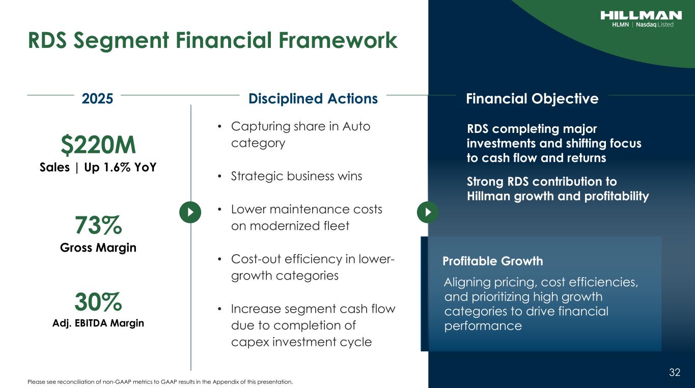 #26673F #102F93 #279A56 #4EA72E#239FFF #0E2841 #279A56 #4EA72E RDS Segment Financial Framework 2025 $220M Sales | Up 1.6% YoY Disciplined Actions • Capturing share in Auto category • Strategic business wins • Lower maintenance costs on modernized fleet • Cost-out efficiency in lower- growth categories • Increase segment cash flow due to completion of capex investment cycle Financial Objective 73% Gross Margin 30% Adj. EBITDA Margin 32 text Profitable Growth Aligning pricing, cost efficiencies, and prioritizing high growth categories to drive financial performance RDS completing major investments and shifting focus to cash flow and returns Strong RDS contribution to Hillman growth and profitability Please see reconciliation of non-GAAP metrics to GAAP results in the Appendix of this presentation.