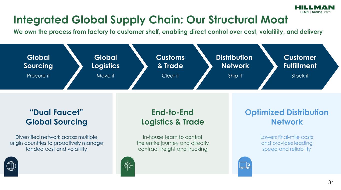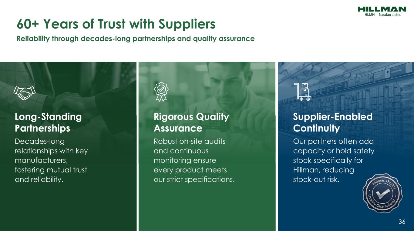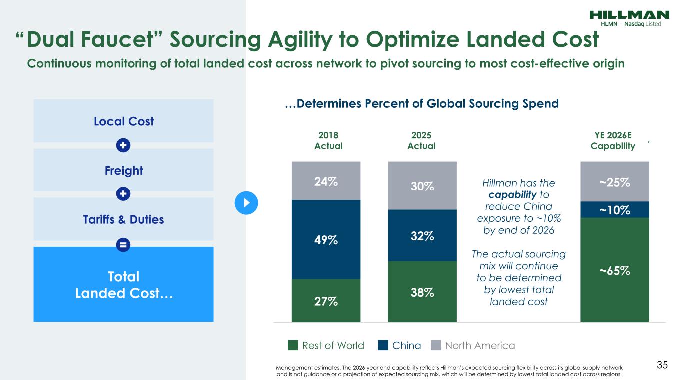 #26673F #102F93 #279A56 #4EA72E#239FFF #0E2841 #279A56 #4EA72E Continuous monitoring of total landed cost across network to pivot sourcing to most cost-effective origin Dual Faucet” Sourcing Agility to Optimize Landed Cost 27% 38% ~65% 49% 32% ~10% 24% 30% ~25% 2018 Actual 2025 Actual YE 2026E Capability Rest of World …Determines Percent of Global Sourcing Spend North AmericaChina Hillman has the capability to reduce China exposure to ~10% by end of 2026 The actual sourcing mix will continue to be determined by lowest total landed cost “ Local Cost Freight Tariffs & Duties Total Landed Cost… 2018 Act l 2025 Ac ual YE 2026E Cap bility 35 text Management estimates. The 2026 year end capability reflects Hillman’s expected sourcing flexibility across its global supply network and is not guidance or a projection of expected sourcing mix, which will be determined by lowest total landed cost across regions.