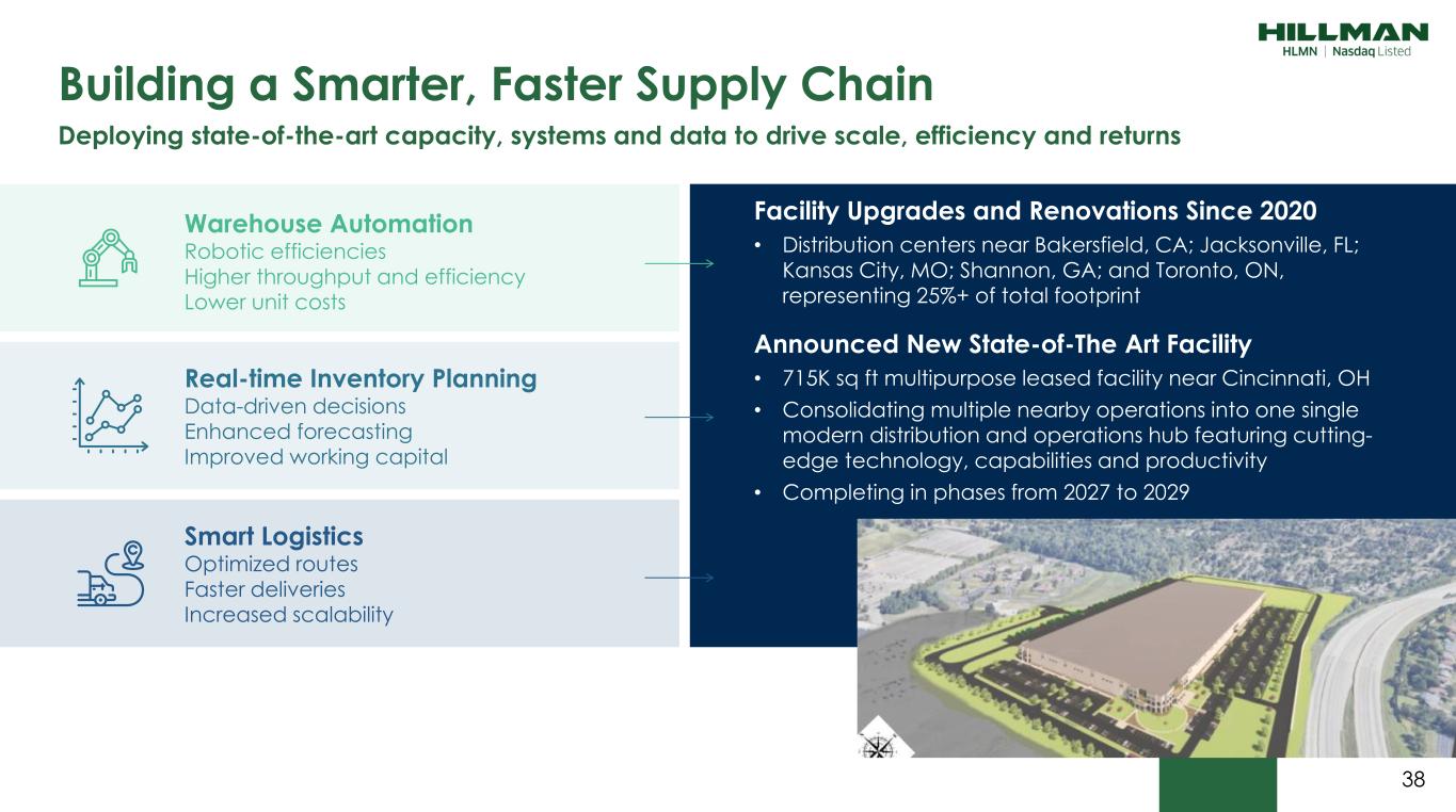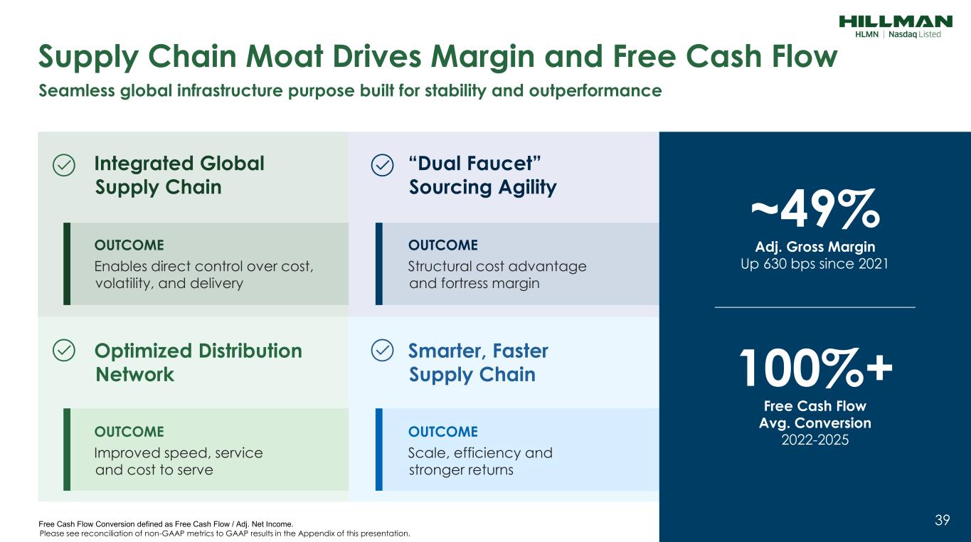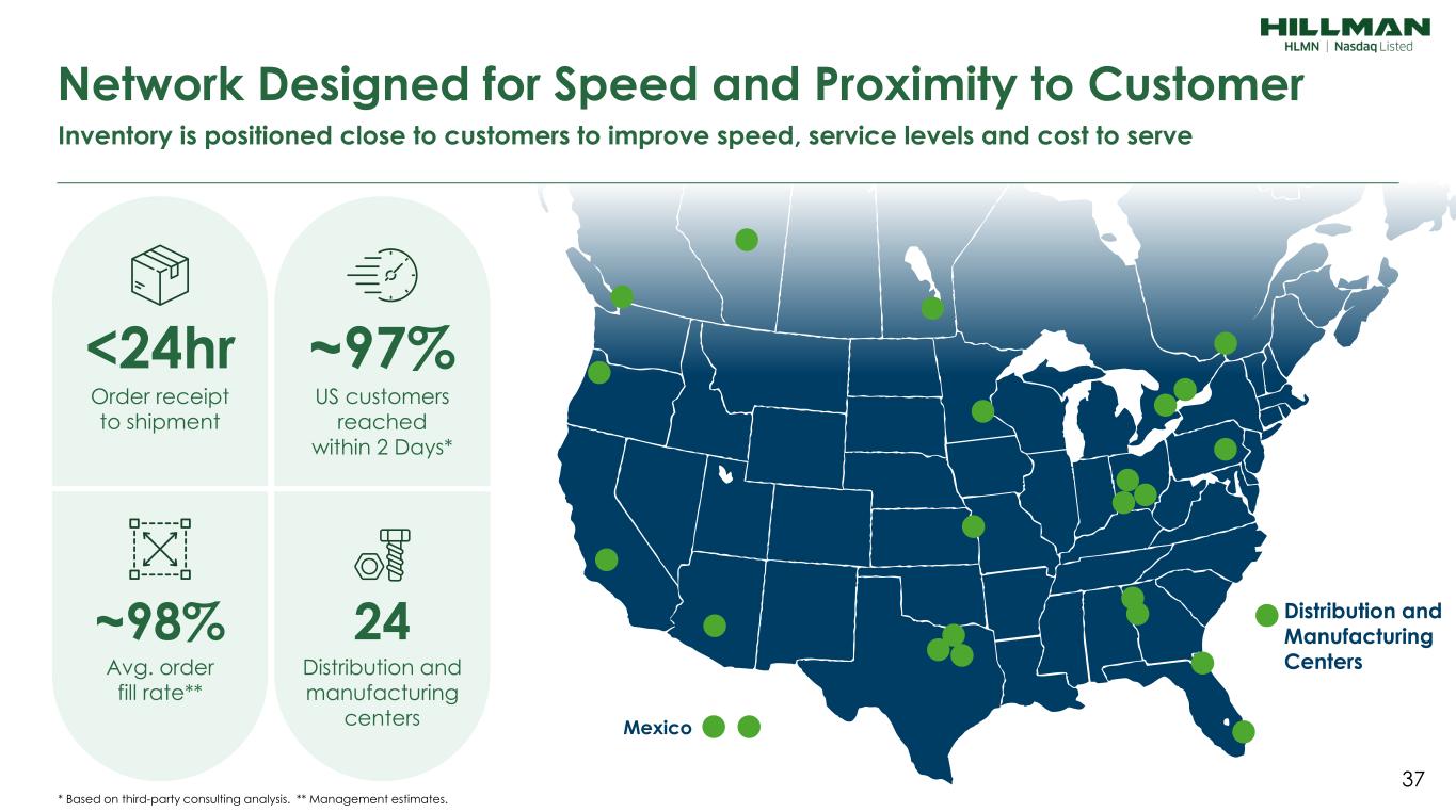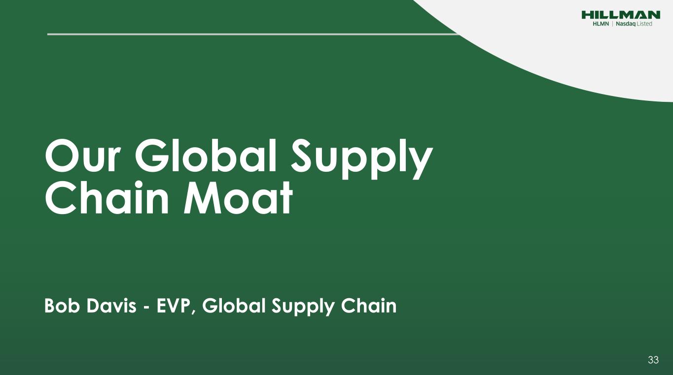 #26673F #102F93 #279A56 #4EA72E#239FFF #0E2841 #279A56 #4EA72E Continuous monitoring of total landed cost across network to pivot sourcing to most cost-effective origin Dual Faucet” Sourcing Agility to Optimize Landed Cost 27% 38% ~65% 49% 32% ~10% 24% 30% ~25% 2018 Actual 2025 Actual YE 2026E Capability Rest of World …Determines Percent of Global Sourcing Spend North AmericaChina Hillman has the capability to reduce China exposure to ~10% by end of 2026 The actual sourcing mix will continue to be determined by lowest total landed cost “ Local Cost Freight Tariffs & Duties Total Landed Cost… 2018 Act l 2025 Ac ual YE 2026E Cap bility 35 text Management estimates. The 2026 year end capability reflects Hillman’s expected sourcing flexibility across its global supply network and is not guidance or a projection of expected sourcing mix, which will be determined by lowest total landed cost across regions.
