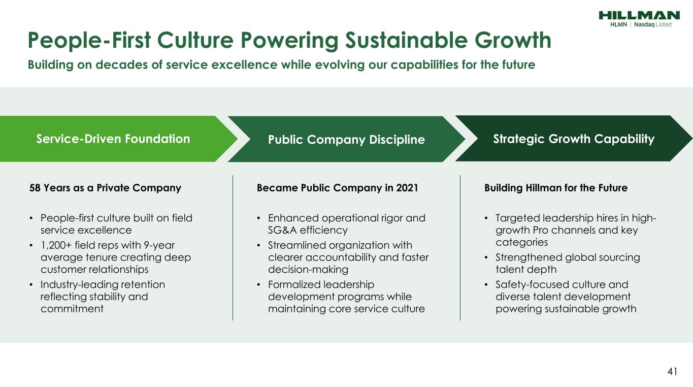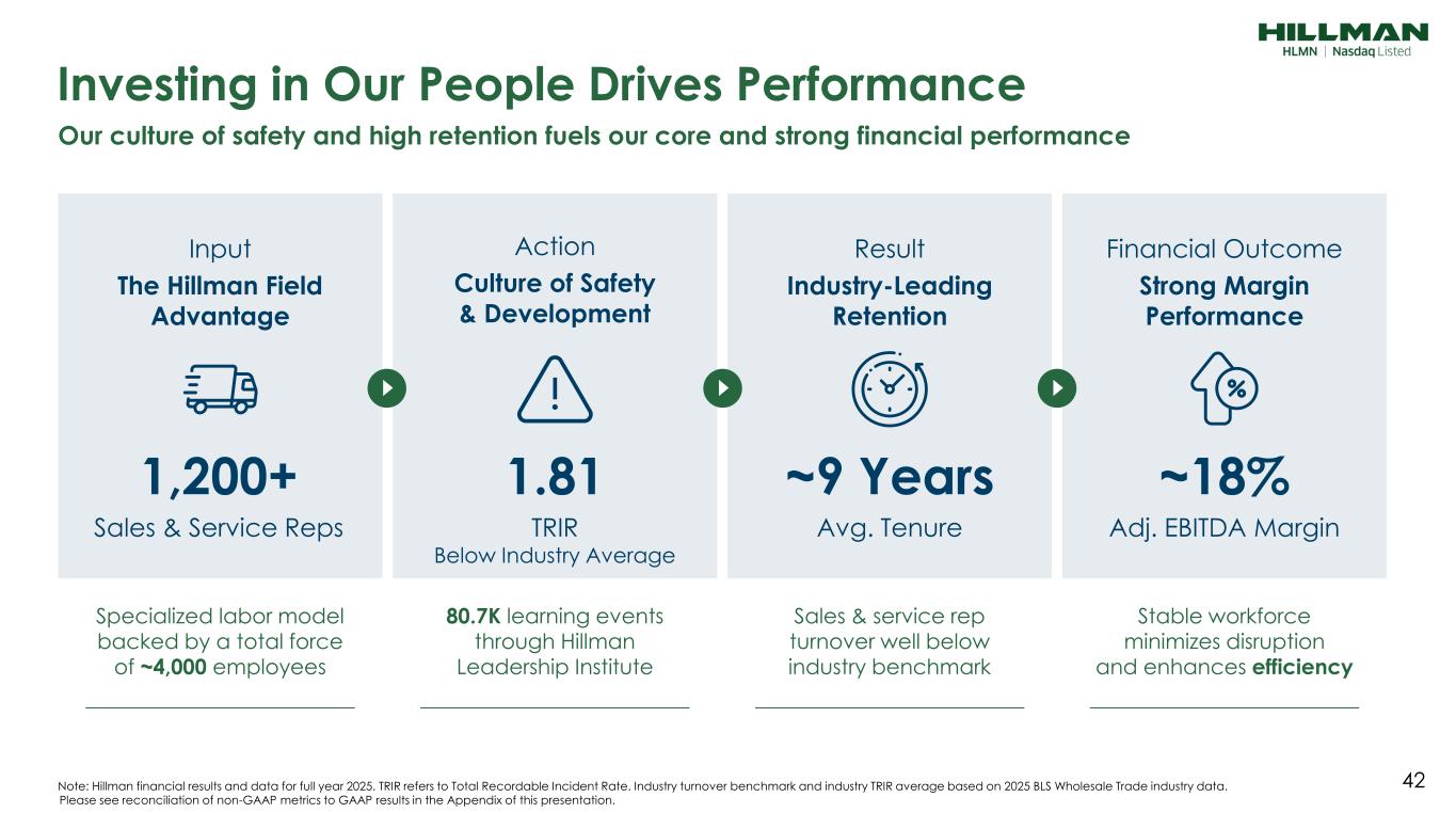 #26673F #102F93 #279A56 #4EA72E#239FFF #0E2841 #279A56 #4EA72E Building on decades of service excellence while evolving our capabilities for the future People-First Culture Powering Sustainable Growth 41 58 Years as a Private Company • People-first culture built on field service excellence • 1,200+ field reps with 9-year average tenure creating deep customer relationships • Industry-leading retention reflecting stability and commitment Became Public Company in 2021 • Enhanced operational rigor and SG&A efficiency • Streamlined organization with clearer accountability and faster decision-making • Formalized leadership development programs while maintaining core service culture Building Hillman for the Future • Targeted leadership hires in high- growth Pro channels and key categories • Strengthened global sourcing talent depth • Safety-focused culture and diverse talent development powering sustainable growth Public Company Discipline Strategic Growth CapabilityService-Driven Foundation