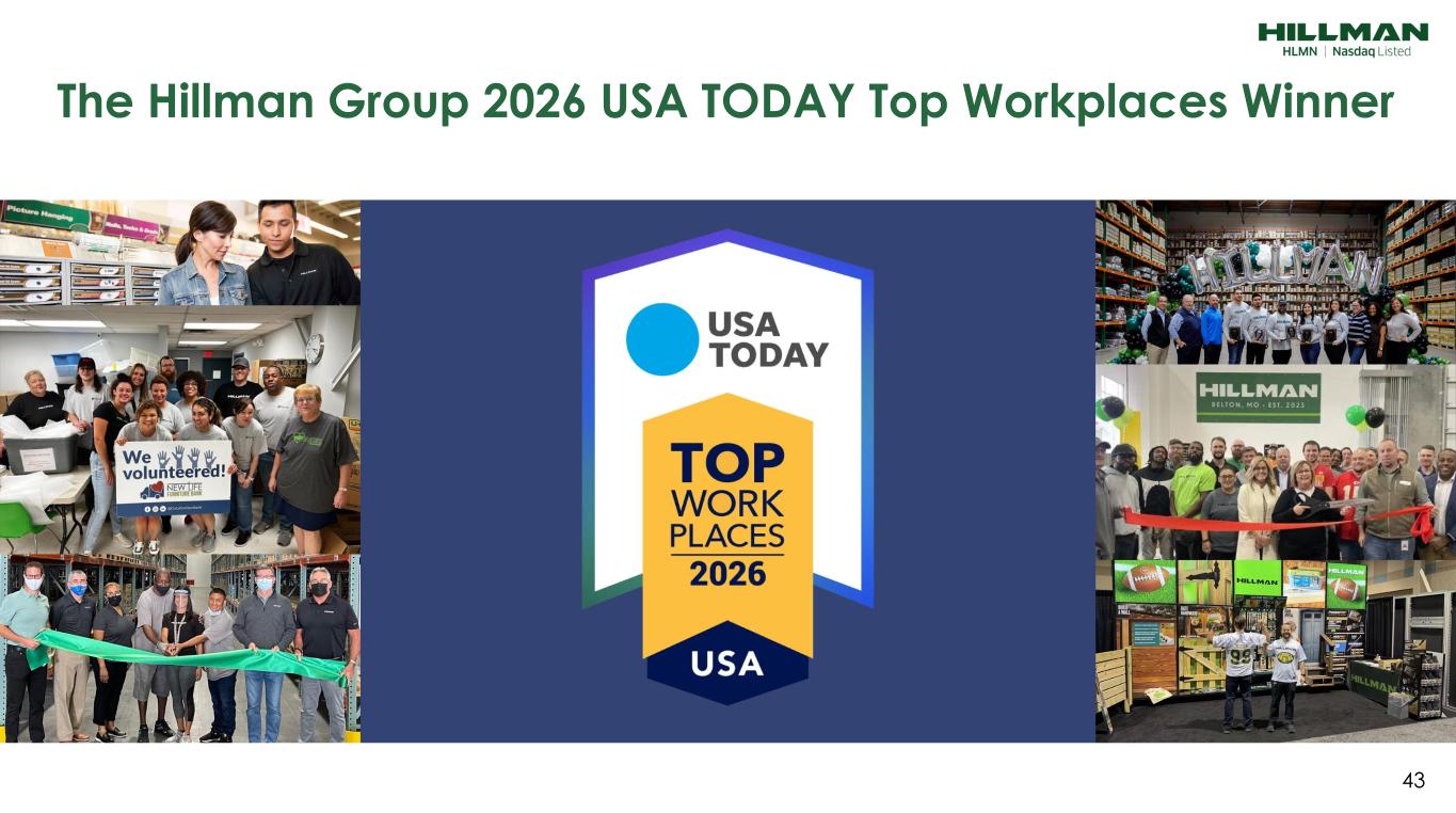 #26673F #102F93 #279A56 #4EA72E#239FFF #0E2841 #279A56 #4EA72E Our culture of safety and high retention fuels our core and strong financial performance Investing in Our People Drives Performance Input The Hillman Field Advantage Action Culture of Safety & Development Result Industry-Leading Retention Financial Outcome Strong Margin Performance 1,200+ Sales & Service Reps 1.81 TRIR Below Industry Average ~9 Years Avg. Tenure ~18% Adj. EBITDA Margin Specialized labor model backed by a total force of ~4,000 employees 80.7K learning events through Hillman Leadership Institute Sales & service rep turnover well below industry benchmark Stable workforce minimizes disruption and enhances efficiency 42 text Note: Hillman financial results and data for full year 2025. TRIR refers to Total Recordable Incident Rate. Industry turnover benchmark and industry TRIR average based on 2025 BLS Wholesale Trade industry data. Please see reconciliation of non-GAAP metrics to GAAP results in the Appendix of this presentation.