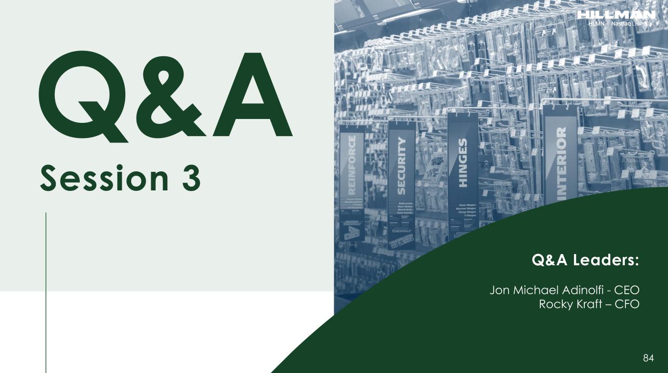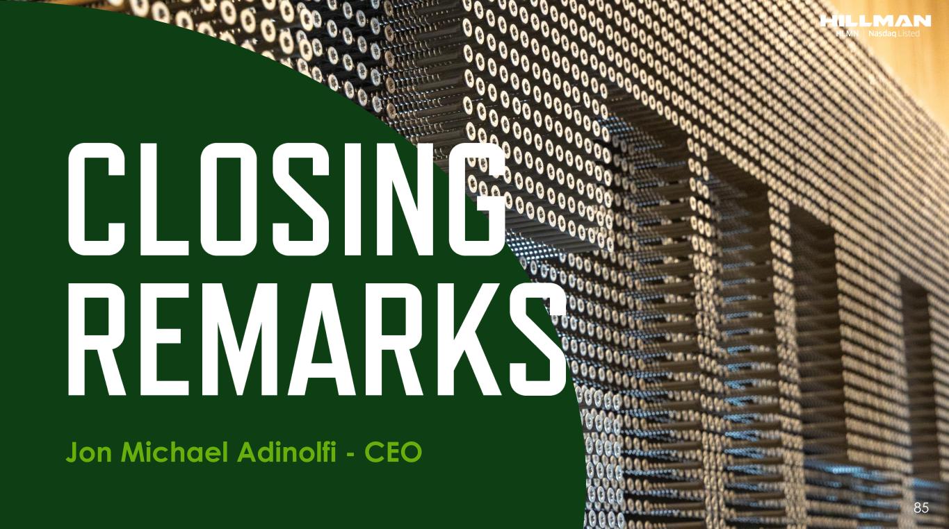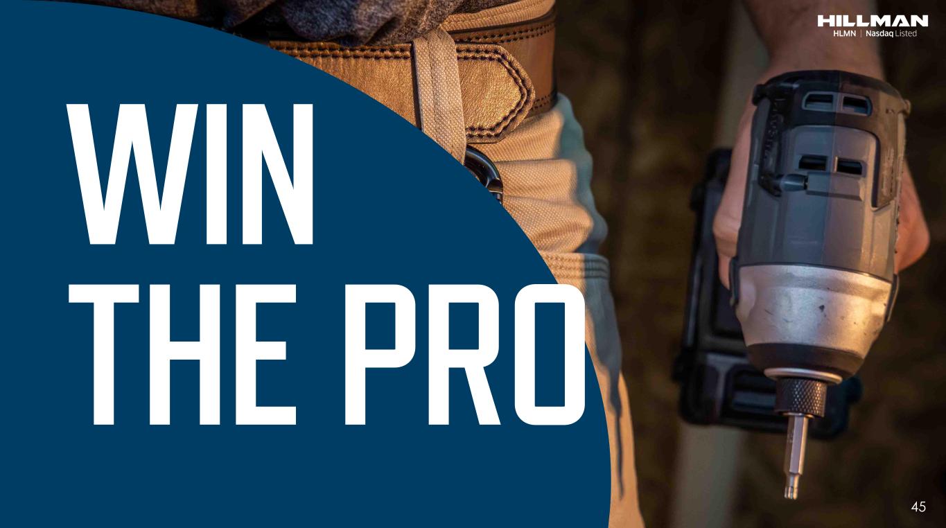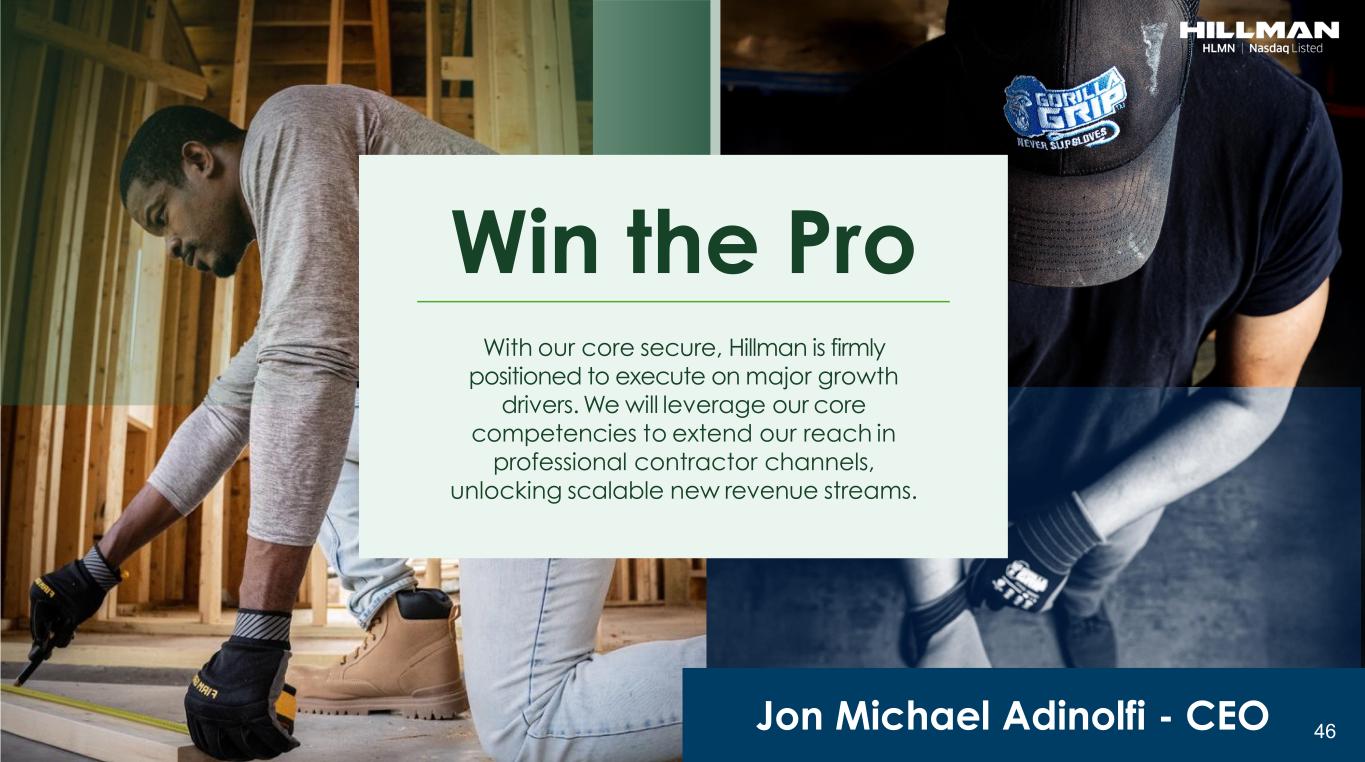#26673F #102F93 #279A56 #4EA72E#239FFF #0E2841 #279A56 #4EA72E Win the Pro With our core secure, Hillman is firmly positioned to execute on major growth drivers. We will leverage our core competencies to extend our reach in professional contractor channels, unlocking scalable new revenue streams. Jon Michael Adinolfi - CEO 46 text