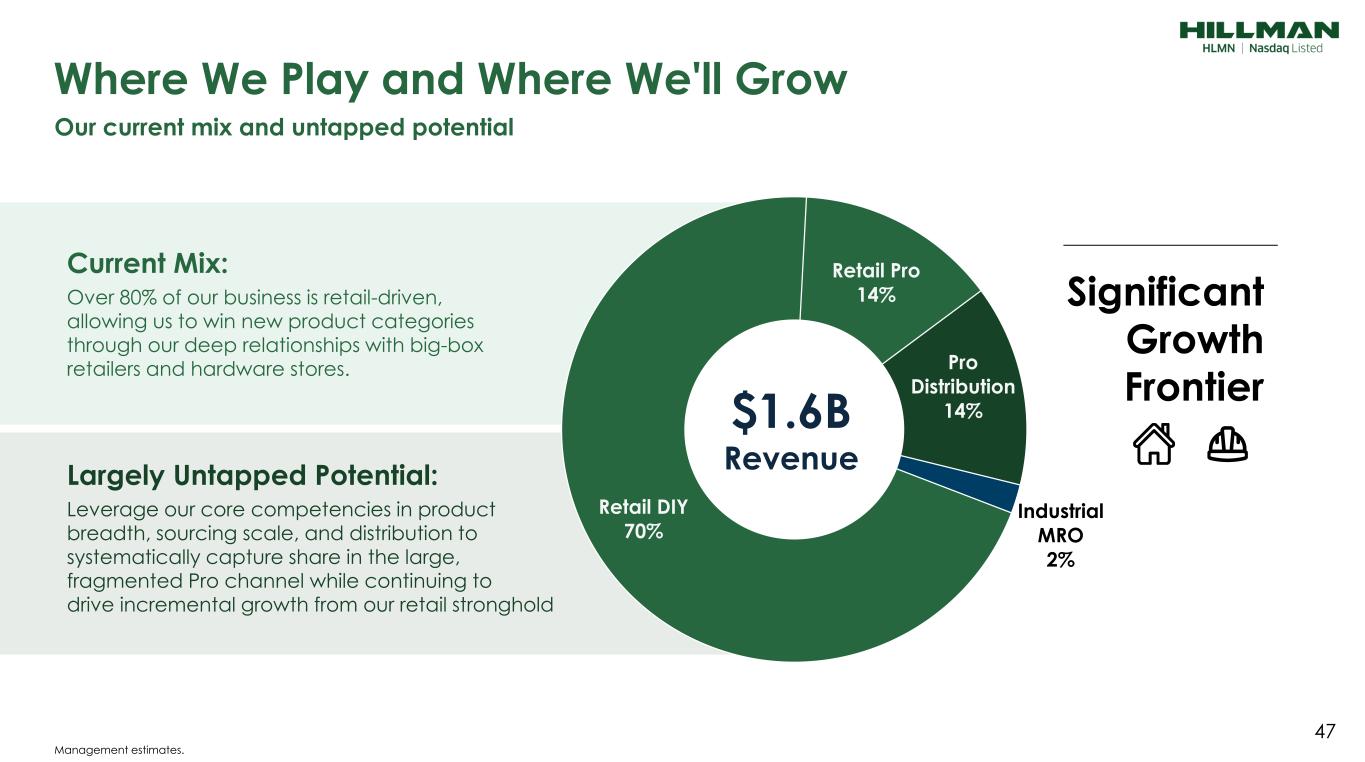 #26673F #102F93 #279A56 #4EA72E#239FFF #0E2841 #279A56 #4EA72E Our current mix and untapped potential Where We Play and Where We'll Grow Current Mix: Over 80% of our business is retail-driven, allowing us to win new product categories through our deep relationships with big-box retailers and hardware stores. Largely Untapped Potential: Leverage our core competencies in product breadth, sourcing scale, and distribution to systematically capture share in the large, fragmented Pro channel while continuing to drive incremental growth from our retail stronghold Significant Growth Frontier 47 $1.6B Revenue text Retail DIY 70% Retail Pro 14% Pro Distribution 14% Industrial MRO 2% Management estimates.