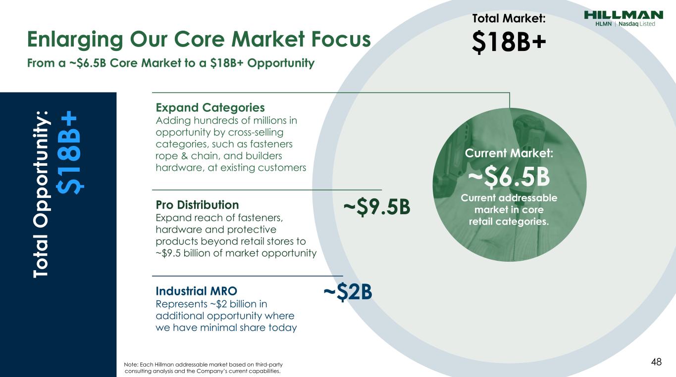 #26673F #102F93 #279A56 #4EA72E#239FFF #0E2841 #279A56 #4EA72E From a ~$6.5B Core Market to a $18B+ Opportunity Enlarging Our Core Market Focus To ta l O p p o rt u n it y : $ 1 8 B + 48 text Expand Categories Adding hundreds of millions in opportunity by cross-selling categories, such as fasteners rope & chain, and builders hardware, at existing customers Pro Distribution Expand reach of fasteners, hardware and protective products beyond retail stores to ~$9.5 billion of market opportunity Total Market: $18B+ Industrial MRO Represents ~$2 billion in additional opportunity where we have minimal share today Current Market: ~$6.5B Current addressable market in core retail categories. ~$9.5B ~$2B Note: Each Hillman addressable market based on third-party consulting analysis and the Company’s current capabilities.