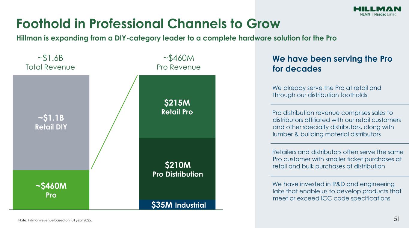#26673F #102F93 #279A56 #4EA72E#239FFF #0E2841 #279A56 #4EA72E Hillman Share ~3% ~$9.5B Addressable Market Multi-lane growth strategy to pursue organic and bolt-on acquisition opportunities Strong Retail Position and Growing Pro Presence text Retail Industrial MRO Growing Pro with Partners Master Distributor Model Expand share-of-wallet with key retail customers moving into Pro Direct and specialty distribution model serving the complex needs of industrial maintenance and repair end markets Pro Distribution Expanding in Distribution Deepen relationships with specialty and lumber & building material distributors 50 Hillman Share ~2%~$2B Addressable Market Hillman Share ~20% ~$6.5B Addressable Market Each Hillman addressable market based on current capabilities Pro and Industrial Distribution Note: Hillman share figures based on full year 2025 revenues. Addressable markets based on third-party consulting analysis and Hillman’s current capabilities.