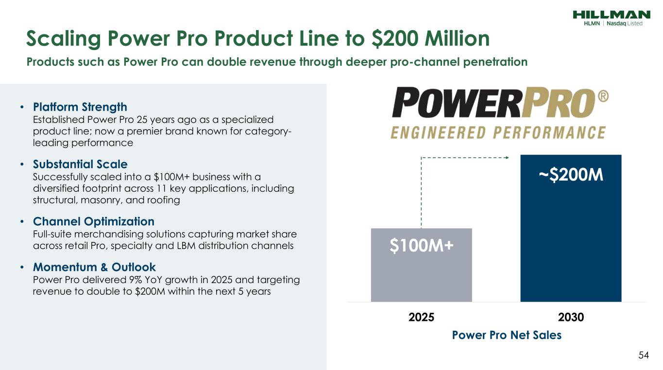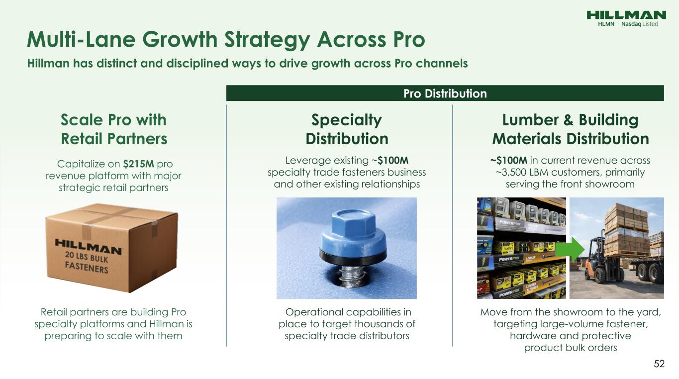 #26673F #102F93 #279A56 #4EA72E#239FFF #0E2841 #279A56 #4EA72E We have been serving the Pro for decades We already serve the Pro at retail and through our distribution footholds Pro distribution revenue comprises sales to distributors affiliated with our retail customers and other specialty distributors, along with lumber & building material distributors Retailers and distributors often serve the same Pro customer with smaller ticket purchases at retail and bulk purchases at distribution We have invested in R&D and engineering labs that enable us to develop products that meet or exceed ICC code specifications Hillman is expanding from a DIY-category leader to a complete hardware solution for the Pro Foothold in Professional Channels to Grow text $1.6B YE 2026E Capability ~$1.6B Total Revenue ~$460M Pro Revenue ~$1.1B Retail DIY ~$460M Pro $215M Retail Pro $210M Pro Distribution $35M Industrial Note: Hillman revenue based on full year 2025. 51