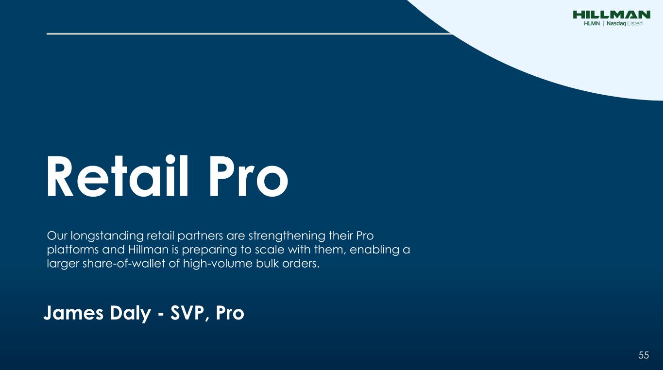 #26673F #102F93 #279A56 #4EA72E#239FFF #0E2841 #279A56 #4EA72E Retail Pro James Daly - SVP, Pro 55 text Our longstanding retail partners are strengthening their Pro platforms and Hillman is preparing to scale with them, enabling a larger share-of-wallet of high-volume bulk orders.