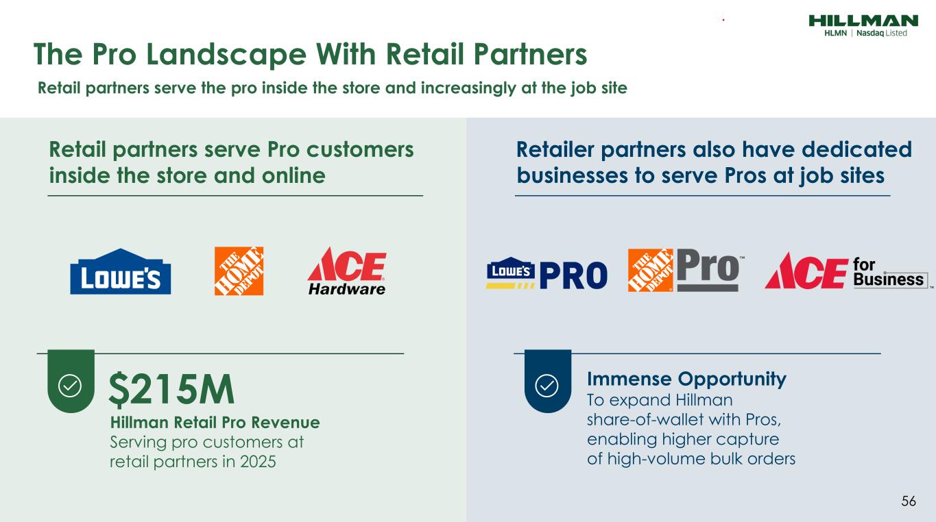 #26673F #102F93 #279A56 #4EA72E#239FFF #0E2841 #279A56 #4EA72E Retail partners serve the pro inside the store and increasingly at the job site The Pro Landscape With Retail Partners Retail partners serve Pro customers inside the store and online Retailer partners also have dedicated businesses to serve Pros at job sites text $215M Hillman Retail Pro Revenue Serving pro customers at retail partners in 2025 Immense Opportunity To expand Hillman share-of-wallet with Pros, enabling higher capture of high-volume bulk orders 56