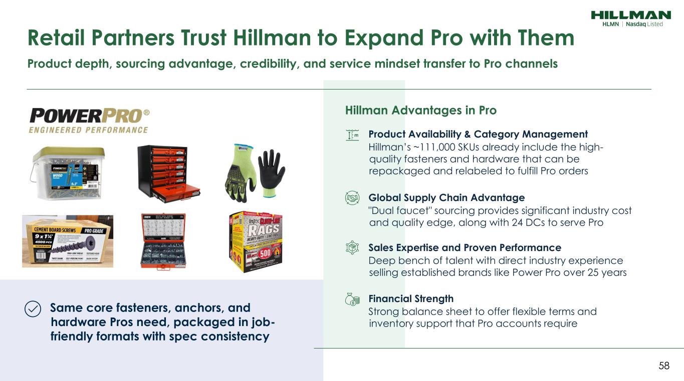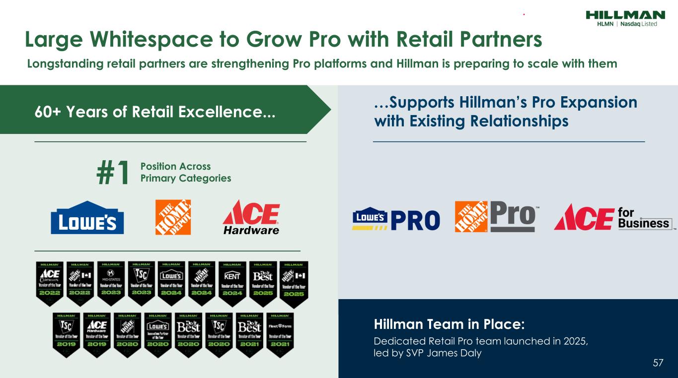 #26673F #102F93 #279A56 #4EA72E#239FFF #0E2841 #279A56 #4EA72E Longstanding retail partners are strengthening Pro platforms and Hillman is preparing to scale with them Large Whitespace to Grow Pro with Retail Partners 60+ Years of Retail Excellence... …Supports Hillman’s Pro Expansion with Existing Relationships #1 Position Across Primary Categories Hillman Team in Place: Dedicated Retail Pro team launched in 2025, led by SVP James Daly 57 text