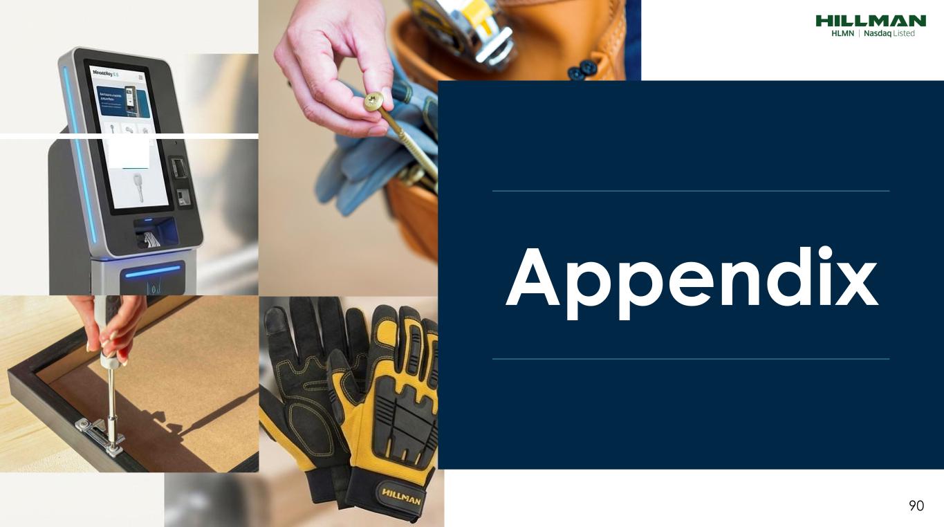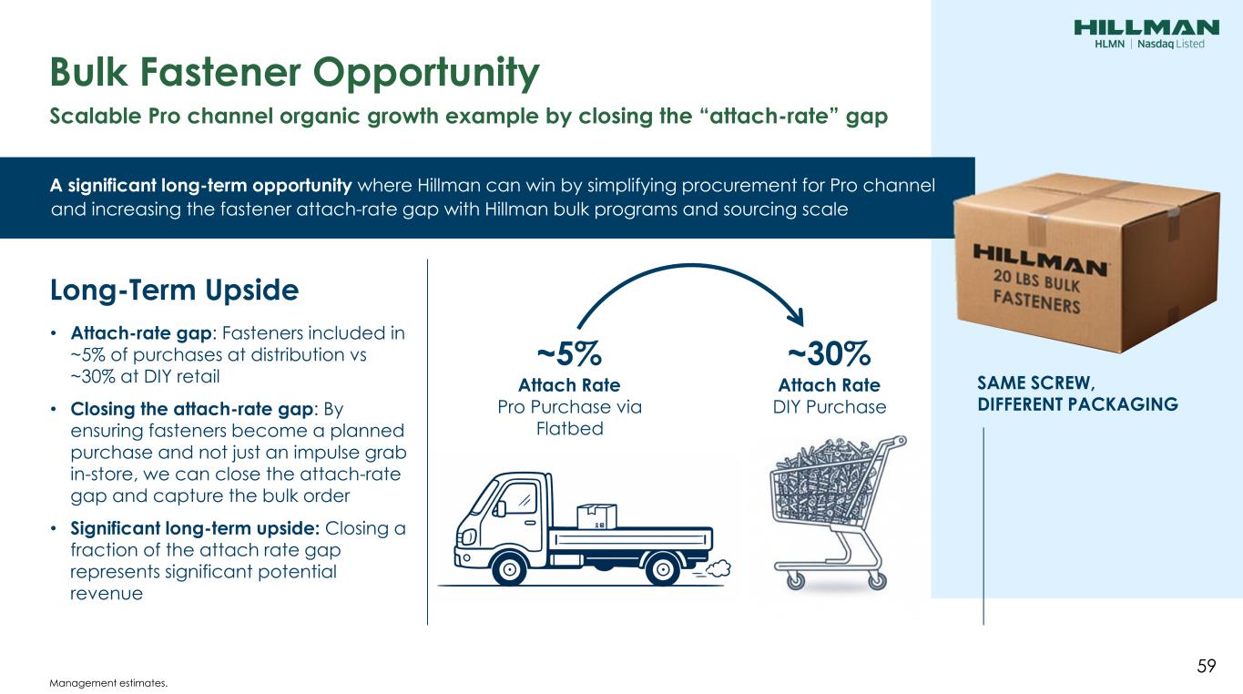 #26673F #102F93 #279A56 #4EA72E#239FFF #0E2841 #279A56 #4EA72E Scalable Pro channel organic growth example by closing the “attach-rate” gap Bulk Fastener Opportunity A significant long-term opportunity where Hillman can win by simplifying procurement for Pro channel and increasing the fastener attach-rate gap with Hillman bulk programs and sourcing scale ~5% Attach Rate Pro Purchase via Flatbed ~30% Attach Rate DIY Purchase Long-Term Upside • Attach-rate gap: Fasteners included in ~5% of purchases at distribution vs ~30% at DIY retail • Closing the attach-rate gap: By ensuring fasteners become a planned purchase and not just an impulse grab in-store, we can close the attach-rate gap and capture the bulk order • Significant long-term upside: Closing a fraction of the attach rate gap represents significant potential revenue SAME SCREW, DIFFERENT PACKAGING 59 text Management estimates.