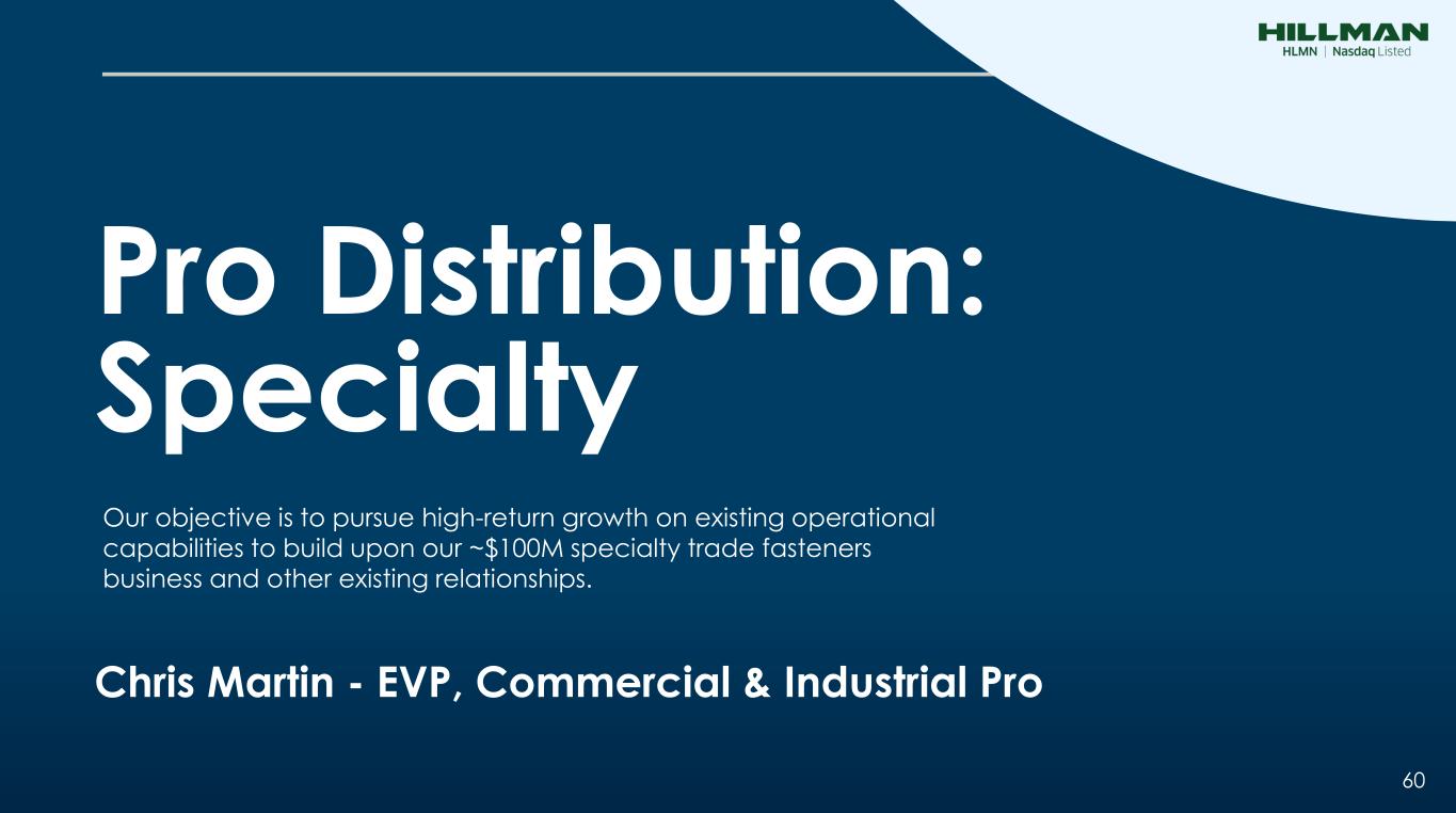 #26673F #102F93 #279A56 #4EA72E#239FFF #0E2841 #279A56 #4EA72E Pro Distribution: Specialty Chris Martin - EVP, Commercial & Industrial Pro 60 text Our objective is to pursue high-return growth on existing operational capabilities to build upon our ~$100M specialty trade fasteners business and other existing relationships.