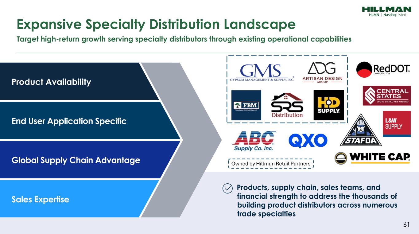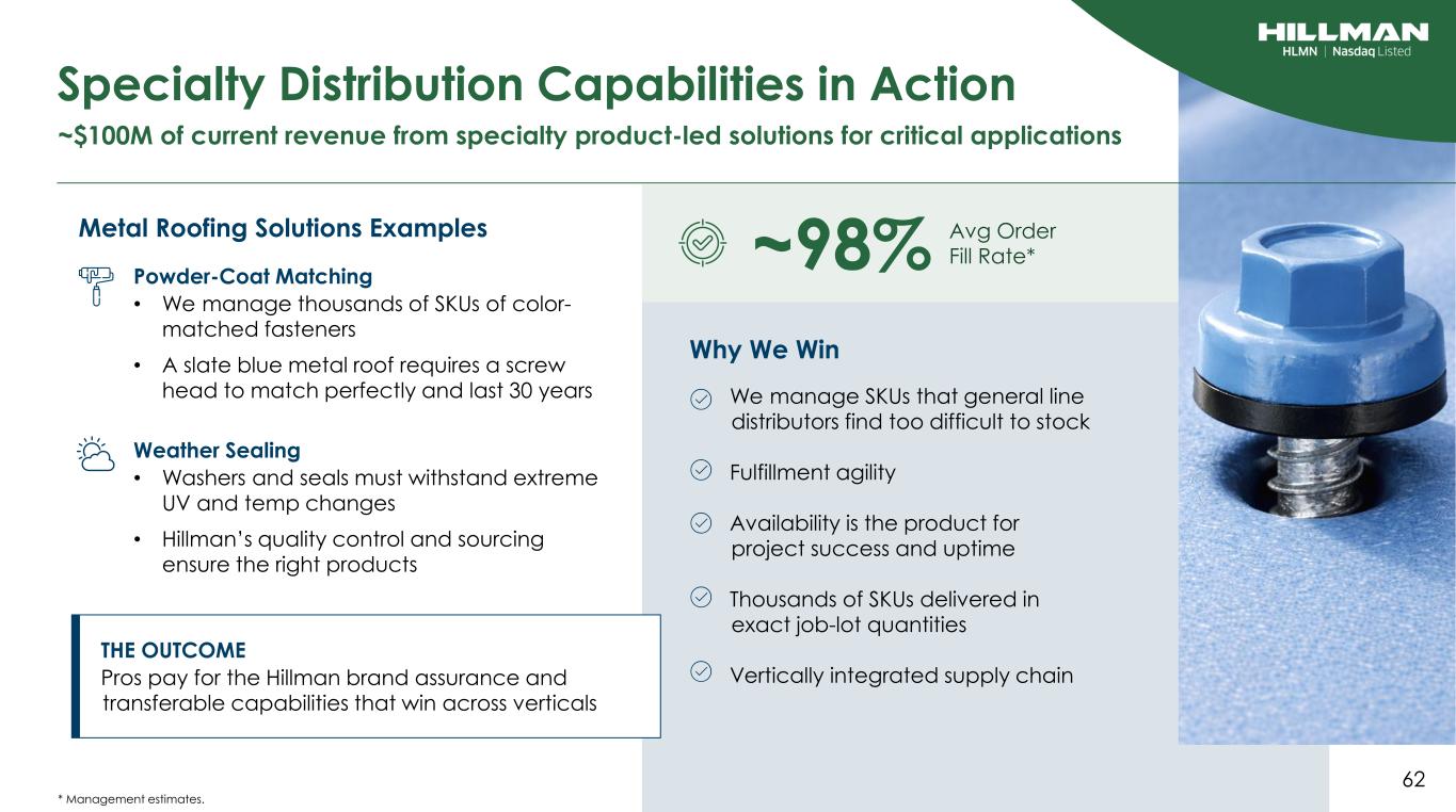 #26673F #102F93 #279A56 #4EA72E#239FFF #0E2841 #279A56 #4EA72E Product Availability End User Application Specific Global Supply Chain Advantage Sales Expertise Target high-return growth serving specialty distributors through existing operational capabilities Expansive Specialty Distribution Landscape Product Depth text Products, supply chain, sales teams, and financial strength to address the thousands of building product distributors across numerous trade specialties Owned by Hillman Retail Partners 61
