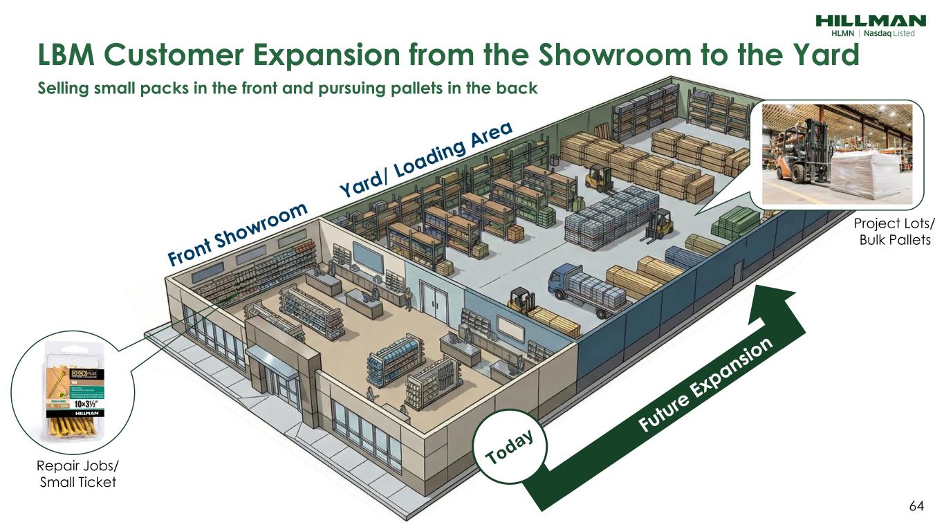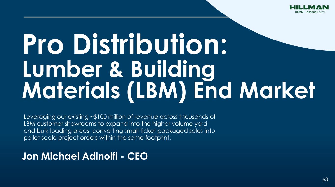 #26673F #102F93 #279A56 #4EA72E#239FFF #0E2841 #279A56 #4EA72E Pro Distribution: Lumber & Building Materials (LBM) End Market Jon Michael Adinolfi - CEO 63 text Leveraging our existing ~$100 million of revenue across thousands of LBM customer showrooms to expand into the higher volume yard and bulk loading areas, converting small ticket packaged sales into pallet-scale project orders within the same footprint.