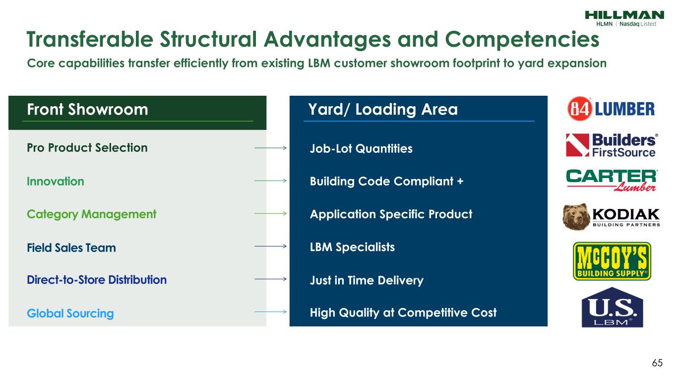 #26673F #102F93 #279A56 #4EA72E#239FFF #0E2841 #279A56 #4EA72E Yard/ Loading Area Core capabilities transfer efficiently from existing LBM customer showroom footprint to yard expansion Transferable Structural Advantages and Competencies 65 text Pro Product Selection Innovation Category Management Field Sales Team Direct-to-Store Distribution Global Sourcing Front Showroom Job-Lot Quantities Building Code Compliant + Application Specific Product LBM Specialists Just in Time Delivery High Quality at Competitive Cost
