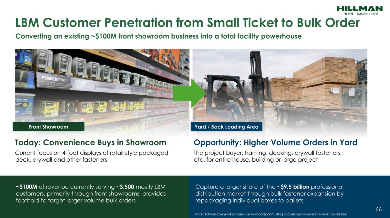 #26673F #102F93 #279A56 #4EA72E#239FFF #0E2841 #279A56 #4EA72E Converting an existing ~$100M front showroom business into a total facility powerhouse LBM Customer Penetration from Small Ticket to Bulk Order ~$100M of revenue currently serving ~3,500 mostly LBM customers, primarily through front showrooms, provides foothold to target larger volume bulk orders Capture a larger share of the ~$9.5 billion professional distribution market through bulk fastener expansion by repackaging individual boxes to pallets 66 text Note: Addressable market based on third-party consulting analysis and Hillman’s current capabilities. Front Showroom Yard / Back Loading Area Today: Convenience Buys in Showroom Current focus on 4-foot displays of retail-style packaged deck, drywall and other fasteners Opportunity: Higher Volume Orders in Yard The project buyer: framing, decking, drywall fasteners, etc. for entire house, building or large project