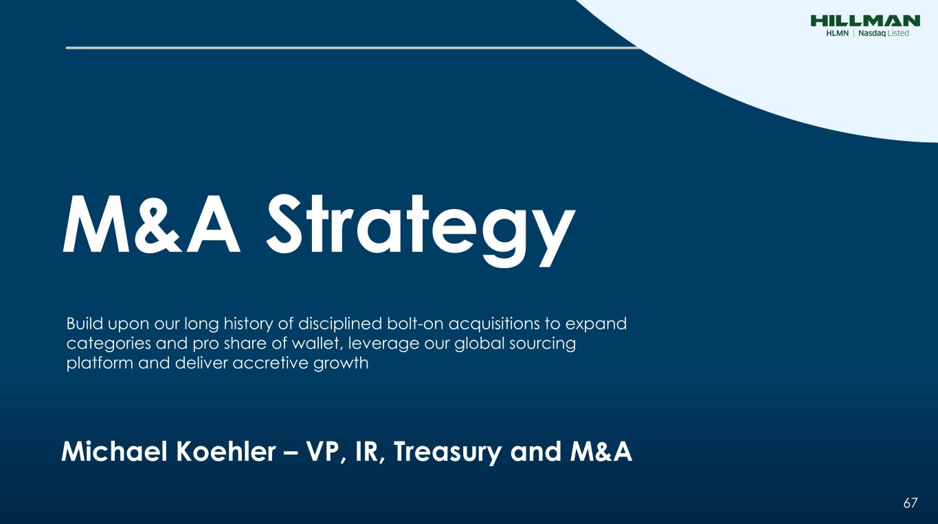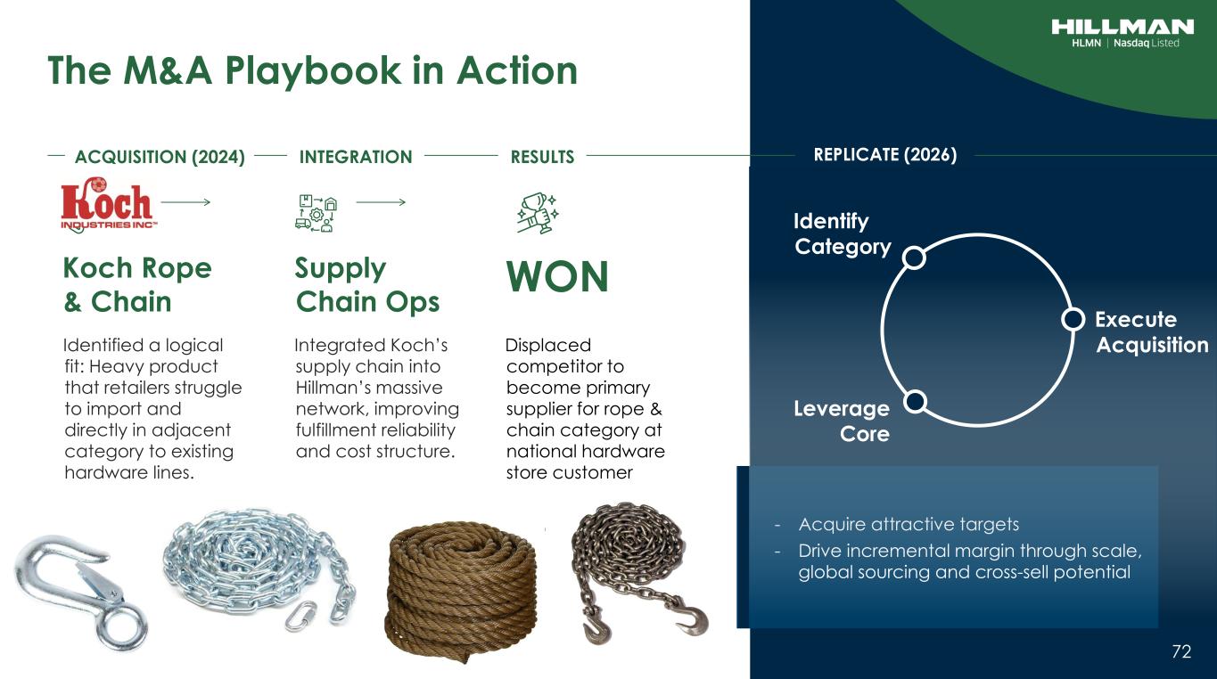 #26673F #102F93 #279A56 #4EA72E#239FFF #0E2841 #279A56 #4EA72E - Acquire attractive targets - Drive incremental margin through scale, global sourcing and cross-sell potential The M&A Playbook in Action ACQUISITION (2024) Koch Rope & Chain Identified a logical fit: Heavy product that retailers struggle to import and directly in adjacent category to existing hardware lines. INTEGRATION Supply Chain Ops Integrated Koch’s supply chain into Hillman’s massive network, improving fulfillment reliability and cost structure. RESULTS WON Displaced competitor to become primary supplier for rope & chain category at national hardware store customer REPLICATE (2026) 72 text Identify Category Execute Acquisition Leverage Core