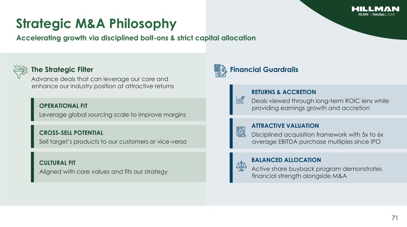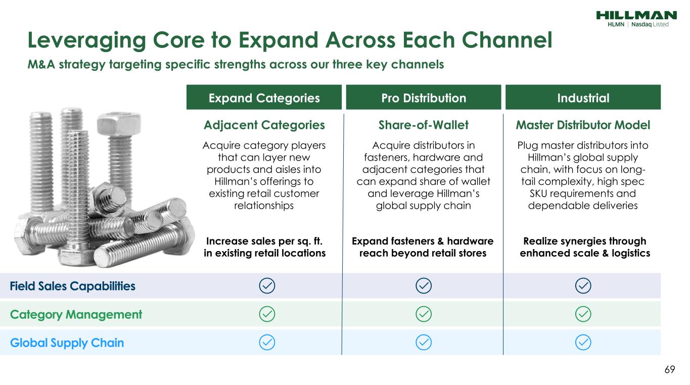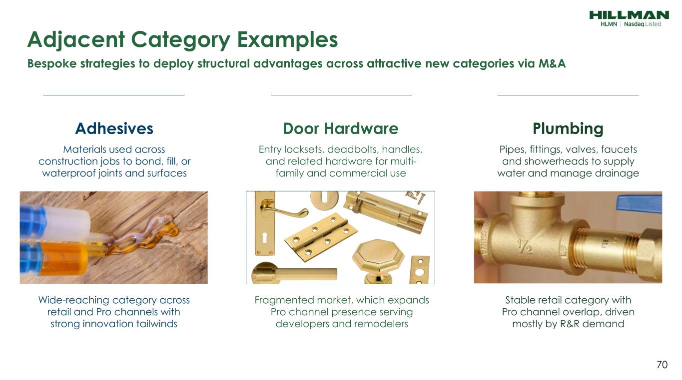#26673F #102F93 #279A56 #4EA72E#239FFF #0E2841 #279A56 #4EA72E M&A strategy targeting specific strengths across our three key channels Leveraging Core to Expand Across Each Channel Global Supply Chain Category Management Expand Categories Pro Distribution Industrial Adjacent Categories Acquire category players that can layer new products and aisles into Hillman’s offerings to existing retail customer relationships Share-of-Wallet Acquire distributors in fasteners, hardware and adjacent categories that can expand share of wallet and leverage Hillman’s global supply chain Master Distributor Model Plug master distributors into Hillman’s global supply chain, with focus on long- tail complexity, high spec SKU requirements and dependable deliveries Increase sales per sq. ft. in existing retail locations Expand fasteners & hardware reach beyond retail stores Realize synergies through enhanced scale & logistics 69 Field Sales Capabilities text