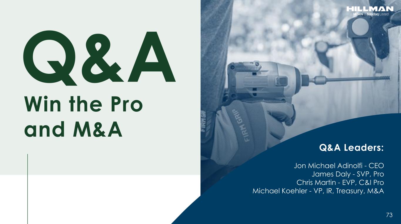 #26673F #102F93 #279A56 #4EA72E#239FFF #0E2841 #279A56 #4EA72E Win the Pro and M&A Q&A Leaders: Jon Michael Adinolfi - CEO James Daly - SVP, Pro Chris Martin - EVP, C&I Pro Michael Koehler - VP, IR, Treasury, M&A 73 text