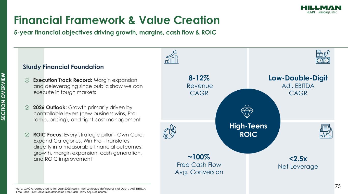 #26673F #102F93 #279A56 #4EA72E#239FFF #0E2841 #279A56 #4EA72E 5-year financial objectives driving growth, margins, cash flow & ROIC Financial Framework & Value Creation Sturdy Financial Foundation Execution Track Record: Margin expansion and deleveraging since public show we can execute in tough markets 2026 Outlook: Growth primarily driven by controllable levers (new business wins, Pro ramp, pricing), and tight cost management ROIC Focus: Every strategic pillar - Own Core, Expand Categories, Win Pro - translates directly into measurable financial outcomes: growth, margin expansion, cash generation, and ROIC improvement S E C TI O N O V E R V IE W High-Teens ROIC 8-12% Revenue CAGR 75 Low-Double-Digit Adj. EBITDA CAGR ~100% Free Cash Flow Avg. Conversion <2.5x Net Leverage text Note: CAGRS compared to full year 2025 results. Net Leverage defined as Net Debt / Adj. EBITDA, Free Cash Flow Conversion defined as Free Cash Flow / Adj. Net Income.