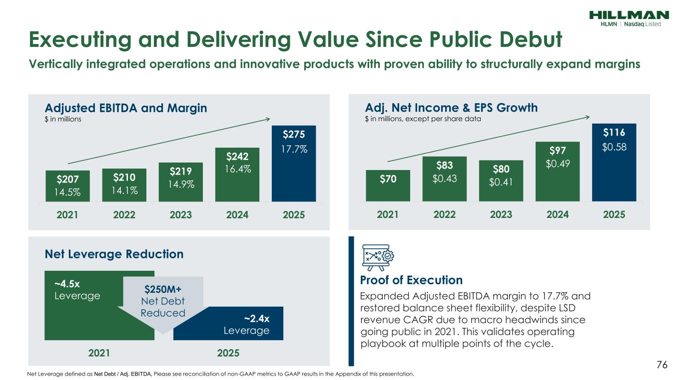 #26673F #102F93 #279A56 #4EA72E#239FFF #0E2841 #279A56 #4EA72E Vertically integrated operations and innovative products with proven ability to structurally expand margins Executing and Delivering Value Since Public Debut Adjusted EBITDA and Margin $ in millions Net Leverage Reduction Proof of Execution Expanded Adjusted EBITDA margin to 17.7% and restored balance sheet flexibility, despite LSD revenue CAGR due to macro headwinds since going public in 2021. This validates operating playbook at multiple points of the cycle. 76 $207 $210 $219 $242 $275 2021 2022 2023 2024 2025 17.7% 16.4% 14.9% 14.1%14.5% ~4.5x Leverage ~2.4x Leverage $250M+ Net Debt Reduced 2021 2025 Adj. Net Income & EPS Growth $ in millions, except per share data $70 $83 $80 $97 $116 2021 2022 2023 2024 2025 $0.58 $0.49 $0.41$0.43 text Net Leverage defined as Net Debt / Adj. EBITDA, Please see reconciliation of non-GAAP metrics to GAAP results in the Appendix of this presentation.