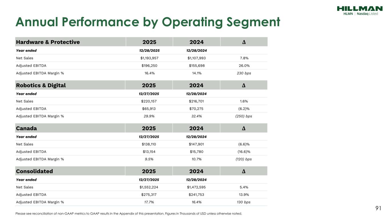 #26673F #102F93 #279A56 #4EA72E#239FFF #0E2841 #279A56 #4EA72E Annual Performance by Operating Segment 91 text Please see reconciliation of non-GAAP metrics to GAAP results in the Appendix of this presentation. Figures in Thousands of USD unless otherwise noted. Hardware & Protective 2025 2024 Δ Year ended 12/28/2025 12/28/2024 Net Sales $1,193,957 $1,107,993 7.8% Adjusted EBITDA $196,250 $155,698 26.0% Adjusted EBITDA Margin % 16.4% 14.1% 230 bps Robotics & Digital 2025 2024 Δ Year ended 12/27/2025 12/28/2024 Net Sales $220,157 $216,701 1.6% Adjusted EBITDA $65,913 $70,275 (6.2)% Adjusted EBITDA Margin % 29.9% 32.4% (250) bps Canada 2025 2024 Δ Year ended 12/27/2025 12/28/2024 Net Sales $138,110 $147,901 (6.6)% Adjusted EBITDA $13,154 $15,780 (16.6)% Adjusted EBITDA Margin % 9.5% 10.7% (120) bps Consolidated 2025 2024 Δ Year ended 12/27/2025 12/28/2024 Net Sales $1,552,224 $1,472,595 5.4% Adjusted EBITDA $275,317 $241,753 13.9% Adjusted EBITDA Margin % 17.7% 16.4% 130 bps