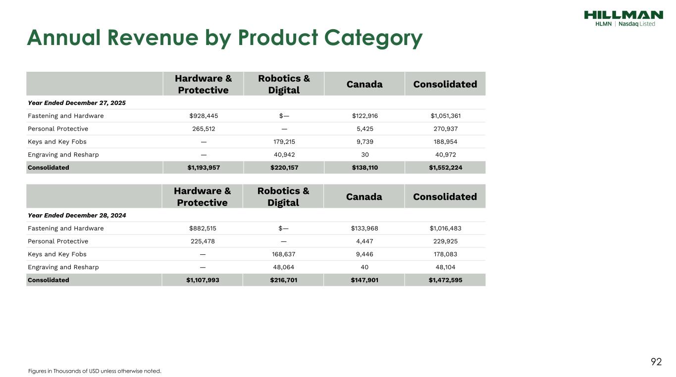 #26673F #102F93 #279A56 #4EA72E#239FFF #0E2841 #279A56 #4EA72E Annual Revenue by Product Category 92 Figures in Thousands of USD unless otherwise noted. Hardware & Protective Robotics & Digital Canada Consolidated Year Ended December 27, 2025 Fastening and Hardware $928,445 $— $122,916 $1,051,361 Personal Protective 265,512 — 5,425 270,937 Keys and Key Fobs — 179,215 9,739 188,954 Engraving and Resharp — 40,942 30 40,972 Consolidated $1,193,957 $220,157 $138,110 $1,552,224 Hardware & Protective Robotics & Digital Canada Consolidated Year Ended December 28, 2024 Fastening and Hardware $882,515 $— $133,968 $1,016,483 Personal Protective 225,478 — 4,447 229,925 Keys and Key Fobs — 168,637 9,446 178,083 Engraving and Resharp — 48,064 40 48,104 Consolidated $1,107,993 $216,701 $147,901 $1,472,595
