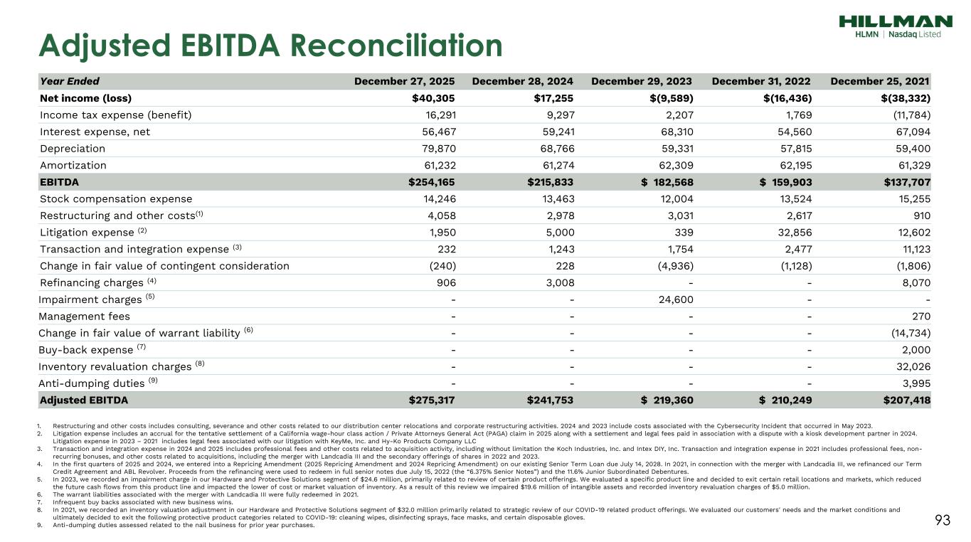 #26673F #102F93 #279A56 #4EA72E#239FFF #0E2841 #279A56 #4EA72E Adjusted EBITDA Reconciliation 93 text Year Ended December 27, 2025 December 28, 2024 December 29, 2023 December 31, 2022 December 25, 2021 Net income (loss) $40,305 $17,255 $(9,589) $(16,436) $(38,332) Income tax expense (benefit) 16,291 9,297 2,207 1,769 (11,784) Interest expense, net 56,467 59,241 68,310 54,560 67,094 Depreciation 79,870 68,766 59,331 57,815 59,400 Amortization 61,232 61,274 62,309 62,195 61,329 EBITDA $254,165 $215,833 $ 182,568 $ 159,903 $137,707 Stock compensation expense 14,246 13,463 12,004 13,524 15,255 Restructuring and other costs(1) 4,058 2,978 3,031 2,617 910 Litigation expense (2) 1,950 5,000 339 32,856 12,602 Transaction and integration expense (3) 232 1,243 1,754 2,477 11,123 Change in fair value of contingent consideration (240) 228 (4,936) (1,128) (1,806) Refinancing charges (4) 906 3,008 - - 8,070 Impairment charges (5) - - 24,600 - - Management fees - - - - 270 Change in fair value of warrant liability (6) - - - - (14,734) Buy-back expense (7) - - - - 2,000 Inventory revaluation charges (8) - - - - 32,026 Anti-dumping duties (9) - - - - 3,995 Adjusted EBITDA $275,317 $241,753 $ 219,360 $ 210,249 $207,418 1. Restructuring and other costs includes consulting, severance and other costs related to our distribution center relocations and corporate restructuring activities. 2024 and 2023 include costs associated with the Cybersecurity Incident that occurred in May 2023. 2. Litigation expense includes an accrual for the tentative settlement of a California wage-hour class action / Private Attorneys General Act (PAGA) claim in 2025 along with a settlement and legal fees paid in association with a dispute with a kiosk development partner in 2024. Litigation expense in 2023 – 2021 includes legal fees associated with our litigation with KeyMe, Inc. and Hy-Ko Products Company LLC 3. Transaction and integration expense in 2024 and 2025 includes professional fees and other costs related to acquisition activity, including without limitation the Koch Industries, Inc. and Intex DIY, Inc. Transaction and integration expense in 2021 includes professional fees, non- recurring bonuses, and other costs related to acquisitions, including the merger with Landcadia III and the secondary offerings of shares in 2022 and 2023. 4. In the first quarters of 2025 and 2024, we entered into a Repricing Amendment (2025 Repricing Amendment and 2024 Repricing Amendment) on our existing Senior Term Loan due July 14, 2028. In 2021, in connection with the merger with Landcadia III, we refinanced our Term Credit Agreement and ABL Revolver. Proceeds from the refinancing were used to redeem in full senior notes due July 15, 2022 (the “6.375% Senior Notes”) and the 11.6% Junior Subordinated Debentures. 5. In 2023, we recorded an impairment charge in our Hardware and Protective Solutions segment of $24.6 million, primarily related to review of certain product offerings. We evaluated a specific product line and decided to exit certain retail locations and markets, which reduced the future cash flows from this product line and impacted the lower of cost or market valuation of inventory. As a result of this review we impaired $19.6 million of intangible assets and recorded inventory revaluation charges of $5.0 million. 6. The warrant liabilities associated with the merger with Landcadia III were fully redeemed in 2021. 7. Infrequent buy backs associated with new business wins. 8. In 2021, we recorded an inventory valuation adjustment in our Hardware and Protective Solutions segment of $32.0 million primarily related to strategic review of our COVID-19 related product offerings. We evaluated our customers' needs and the market conditions and ultimately decided to exit the following protective product categories related to COVID-19: cleaning wipes, disinfecting sprays, face masks, and certain disposable gloves. 9. Anti-dumping duties assessed related to the nail business for prior year purchases.