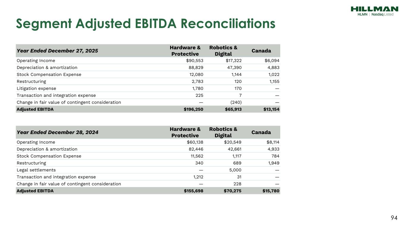 #26673F #102F93 #279A56 #4EA72E#239FFF #0E2841 #279A56 #4EA72E Segment Adjusted EBITDA Reconciliations 94 Year Ended December 27, 2025 Hardware & Protective Robotics & Digital Canada Operating Income $90,553 $17,322 $6,094 Depreciation & amortization 88,829 47,390 4,883 Stock Compensation Expense 12,080 1,144 1,022 Restructuring 2,783 120 1,155 Litigation expense 1,780 170 — Transaction and integration expense 225 7 — Change in fair value of contingent consideration — (240) — Adjusted EBITDA $196,250 $65,913 $13,154 Year Ended December 28, 2024 Hardware & Protective Robotics & Digital Canada Operating Income $60,138 $20,549 $8,114 Depreciation & amortization 82,446 42,661 4,933 Stock Compensation Expense 11,562 1,117 784 Restructuring 340 689 1,949 Legal settlements — 5,000 — Transaction and integration expense 1,212 31 — Change in fair value of contingent consideration — 228 — Adjusted EBITDA $155,698 $70,275 $15,780